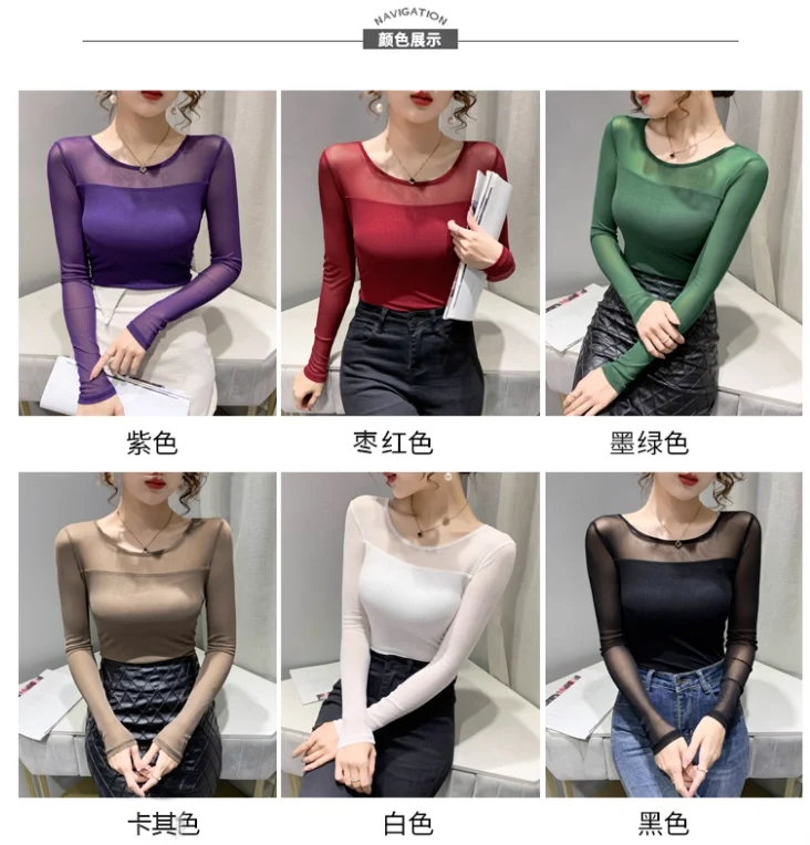 Autumn Winter Round Neck T shirt Women Sexy Mesh Bottoming Shirt Long Sleeve Solid Color Slim Fit Long Sleeve Casual Tops