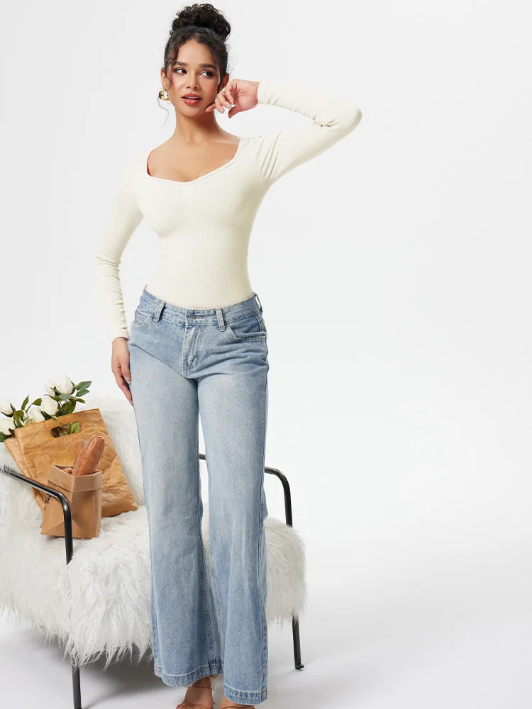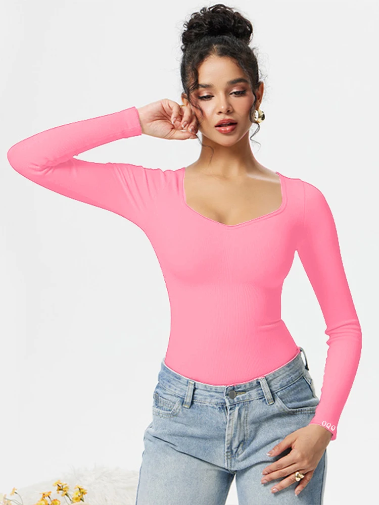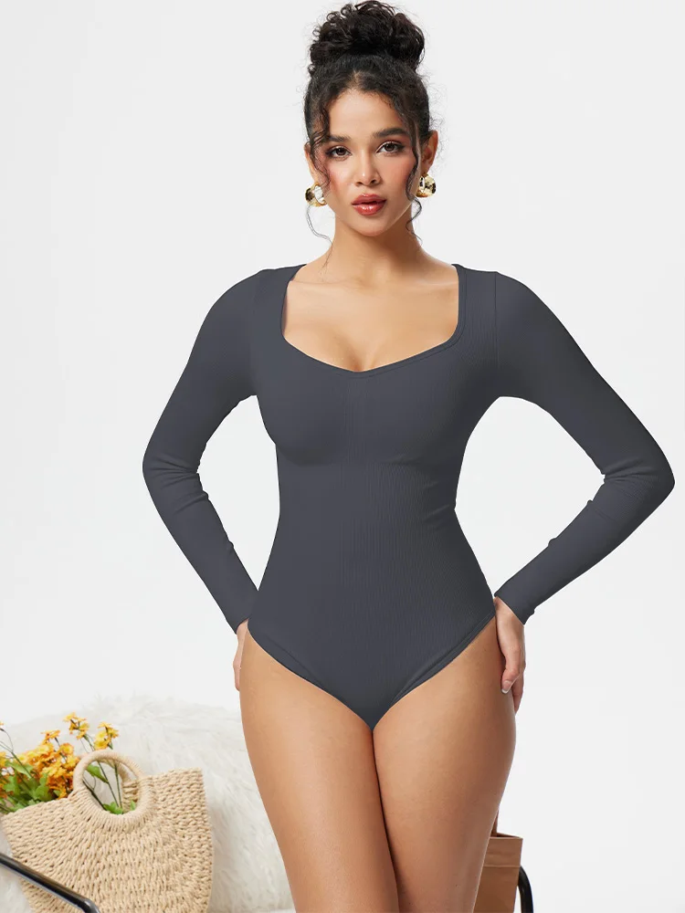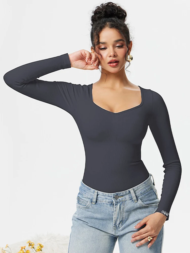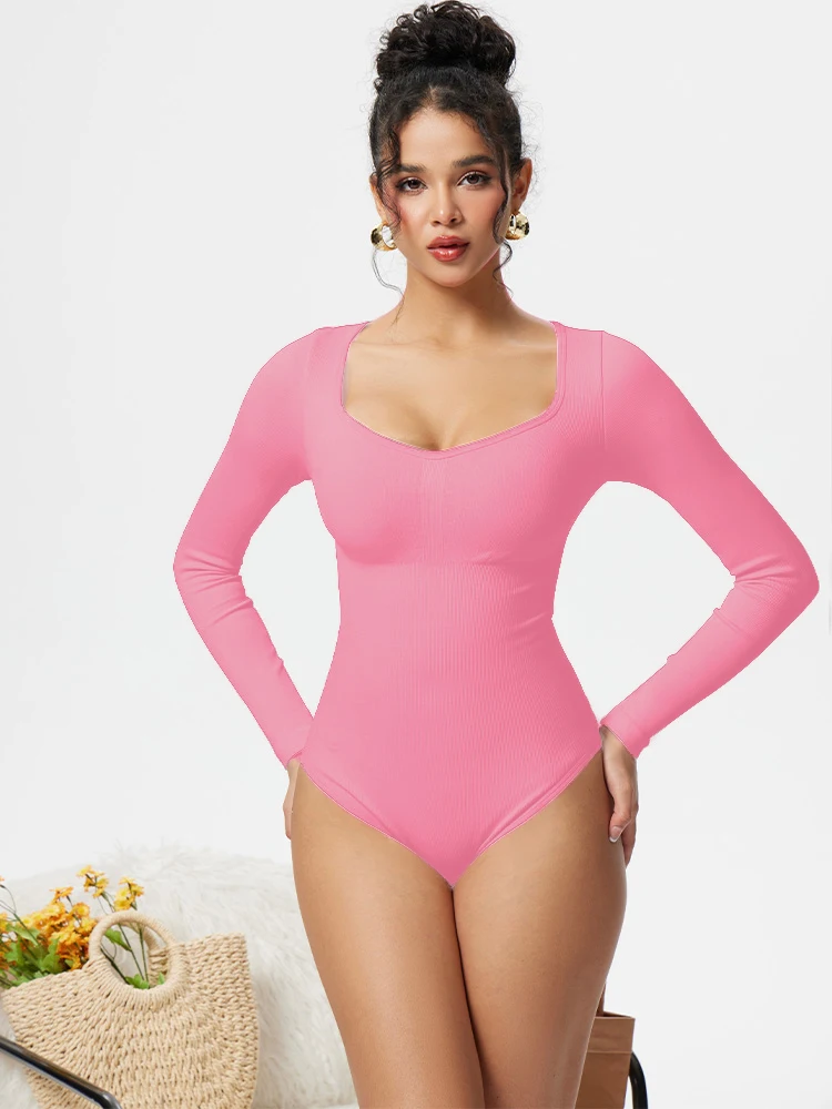 Autumn Winter Women’s Long Sleeve Square Collar Bodysuit Solid Color Casual Ribbed Bodysuit Elastic Knitted Slim Bodysuit