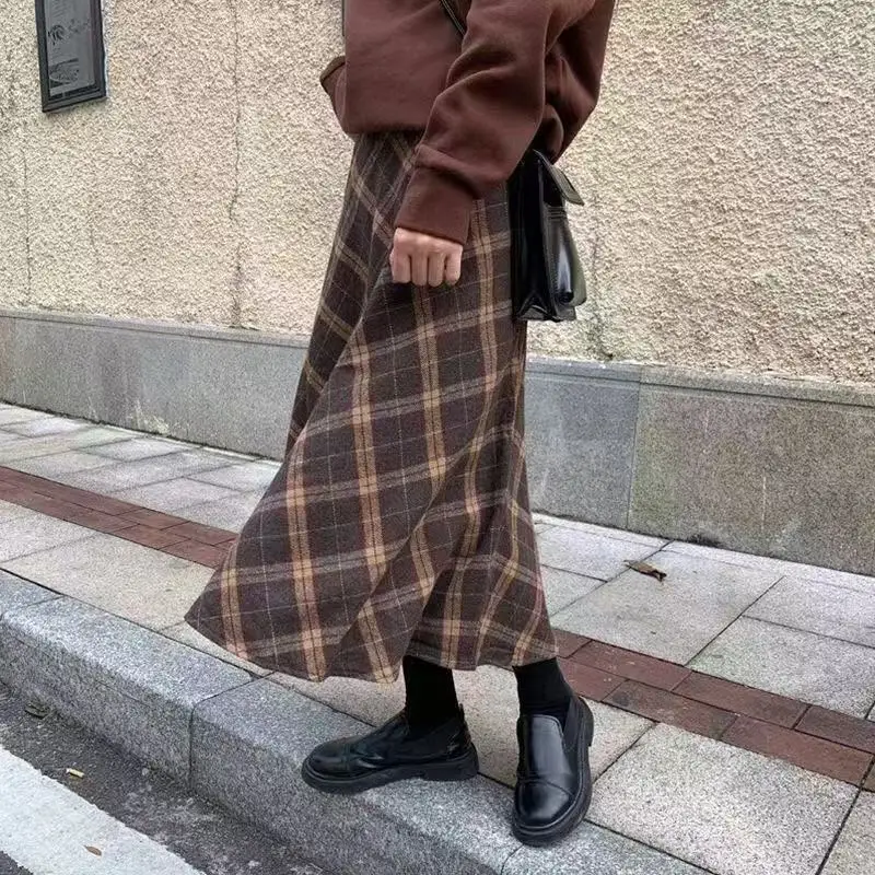 Autumn Winter Woolen Knee-Length A-Line Skirt Women’s Versatile Slimming Midi Skirt Casual High Waist Plaid f-Length Skirt