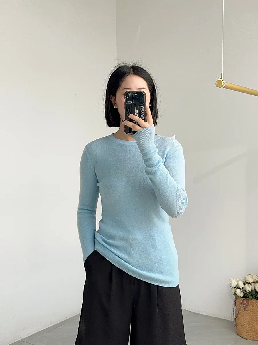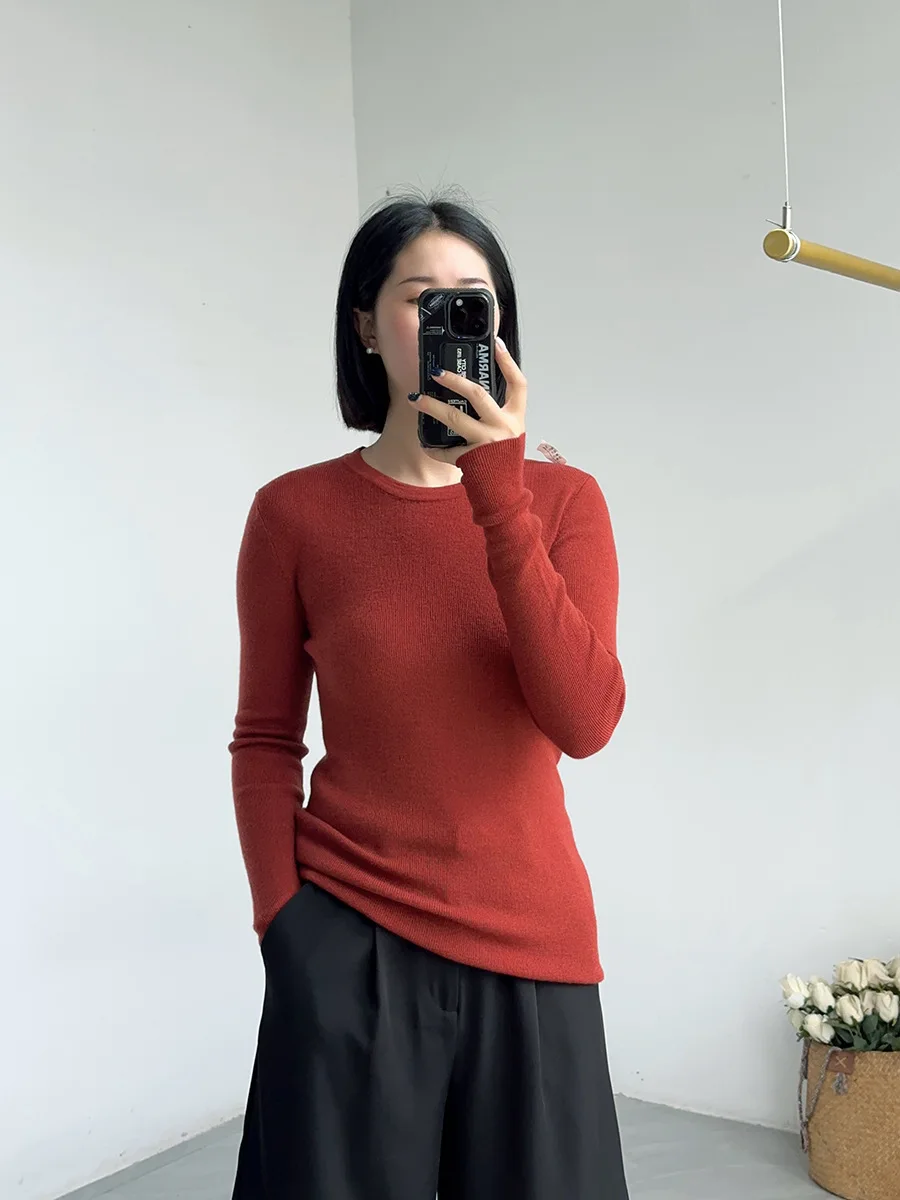 Birdtree 100%Pure Wool Elegant Thin Sweater, Women O Neck Long Sleeve, Basics Bottom Knit Tops, 2025 Winter Autumn New T46839QM