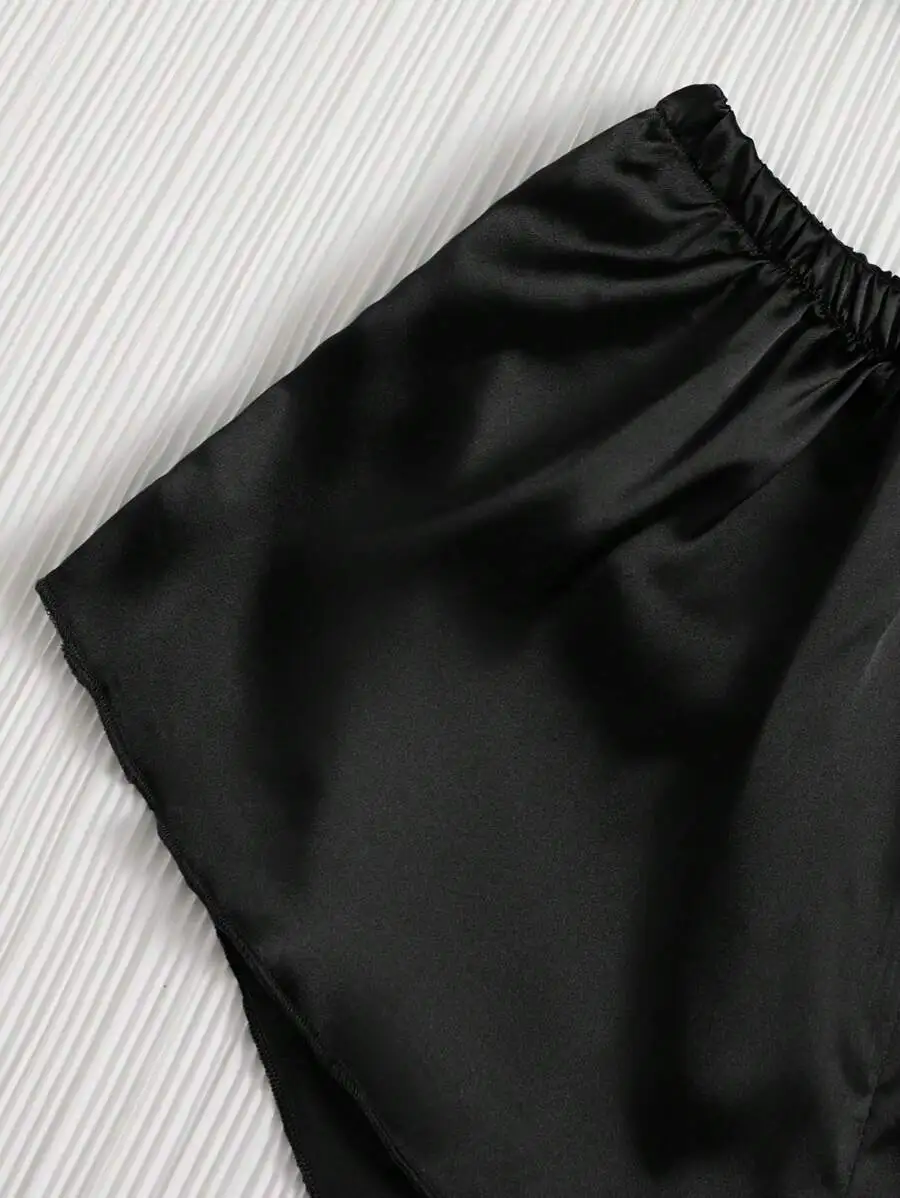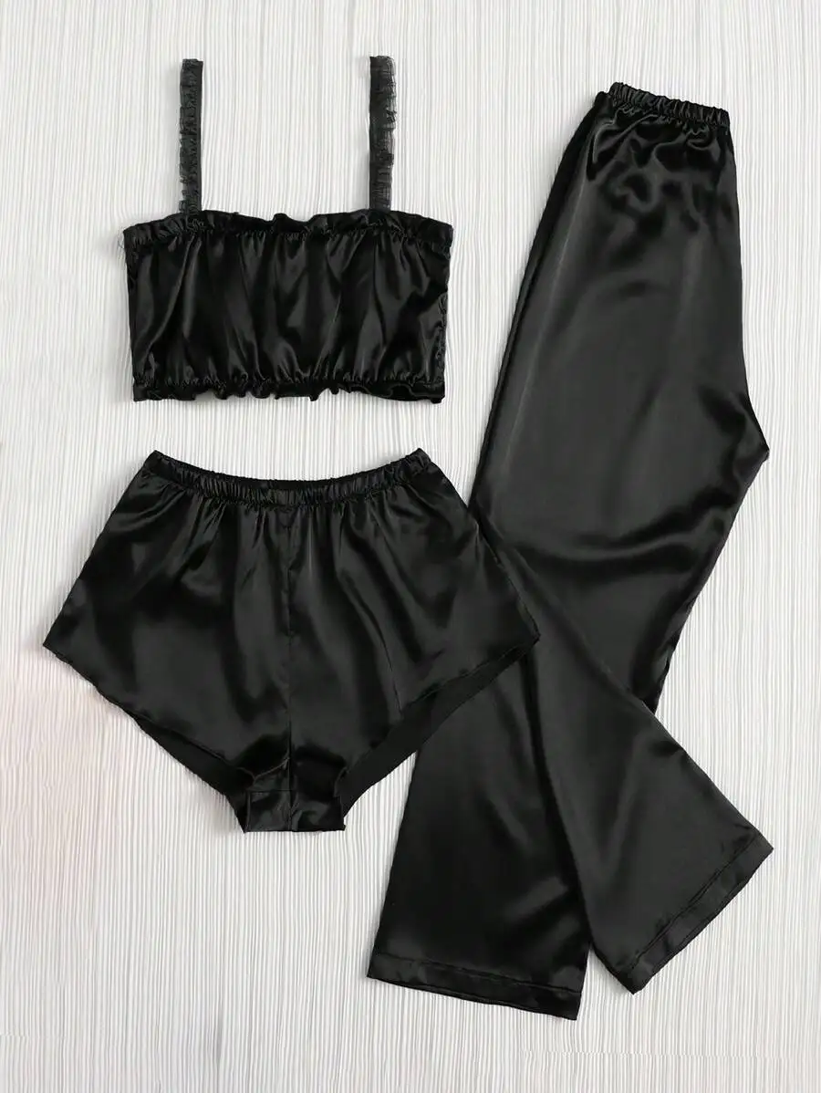 Black Color Pleated Satin Pajamas Set Including Camisole Shorts And Long Pants Silk Women Sexy Sleepwear Summer Lingerie Bra