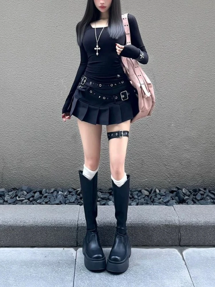 Black High Street Gothic Rivet Mini Skirt Woman Y2K Style Korean Fashion Aesthetic Skirts Elegant Retro A-line Denim Outfit 2025