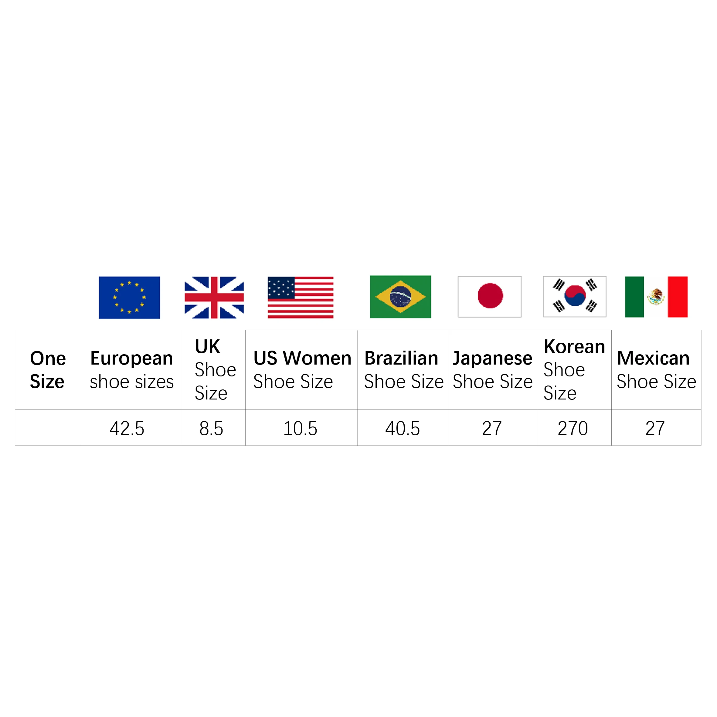 {"sizeInfoList":[{"countrySizeMap":{"EU":"42","BR":"40.5","JP":"26.5","UK":"7","KR":"270","MX":"27","US":"9"},"length":{"cm":"27","inch":"10.63"},"size":"One Size","vid":200001058}]} |