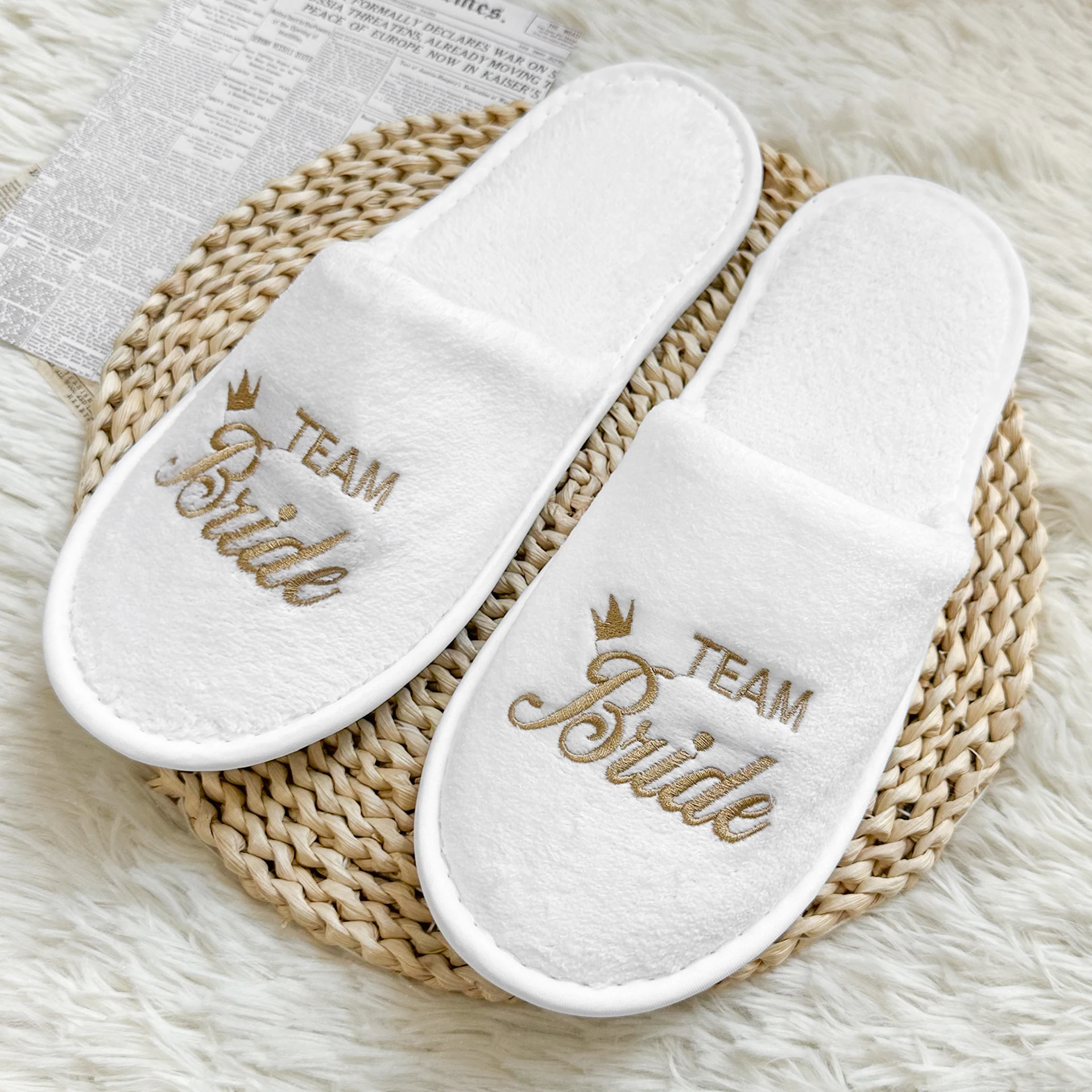 Bridal Party Slippers Set, Close-toe With Golden & Pink Embroidery, Lightweight Plush Cozy Flats, Non-slip Soft Sole For Bride