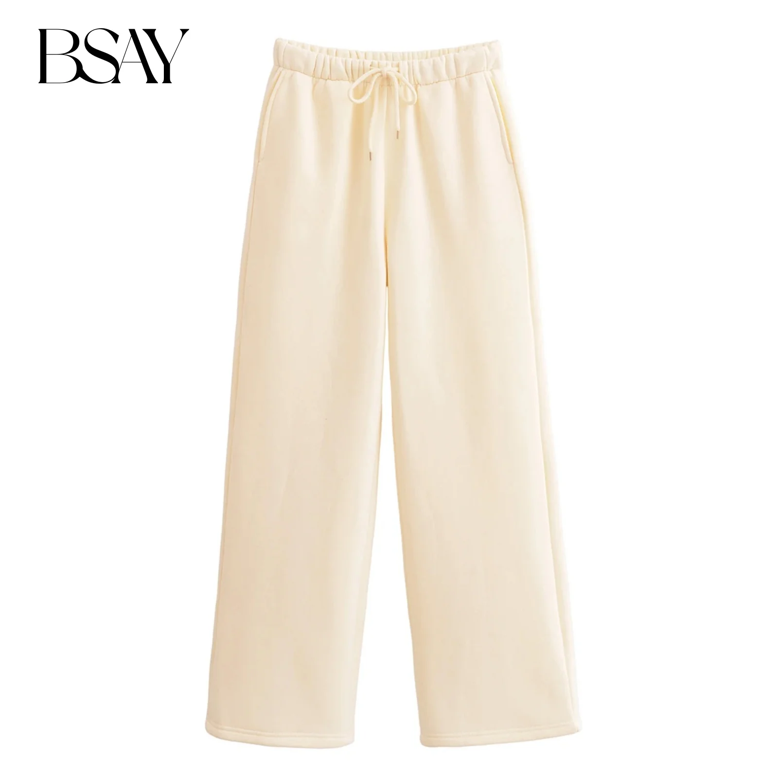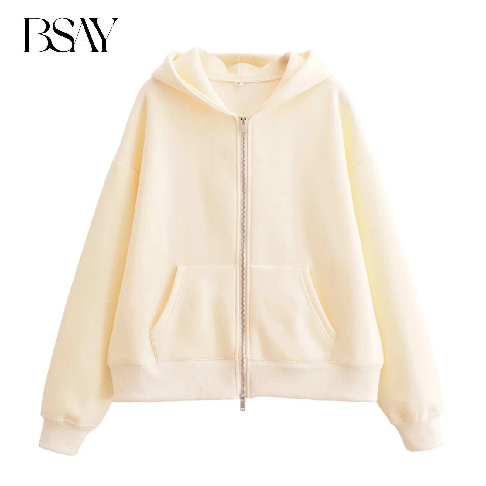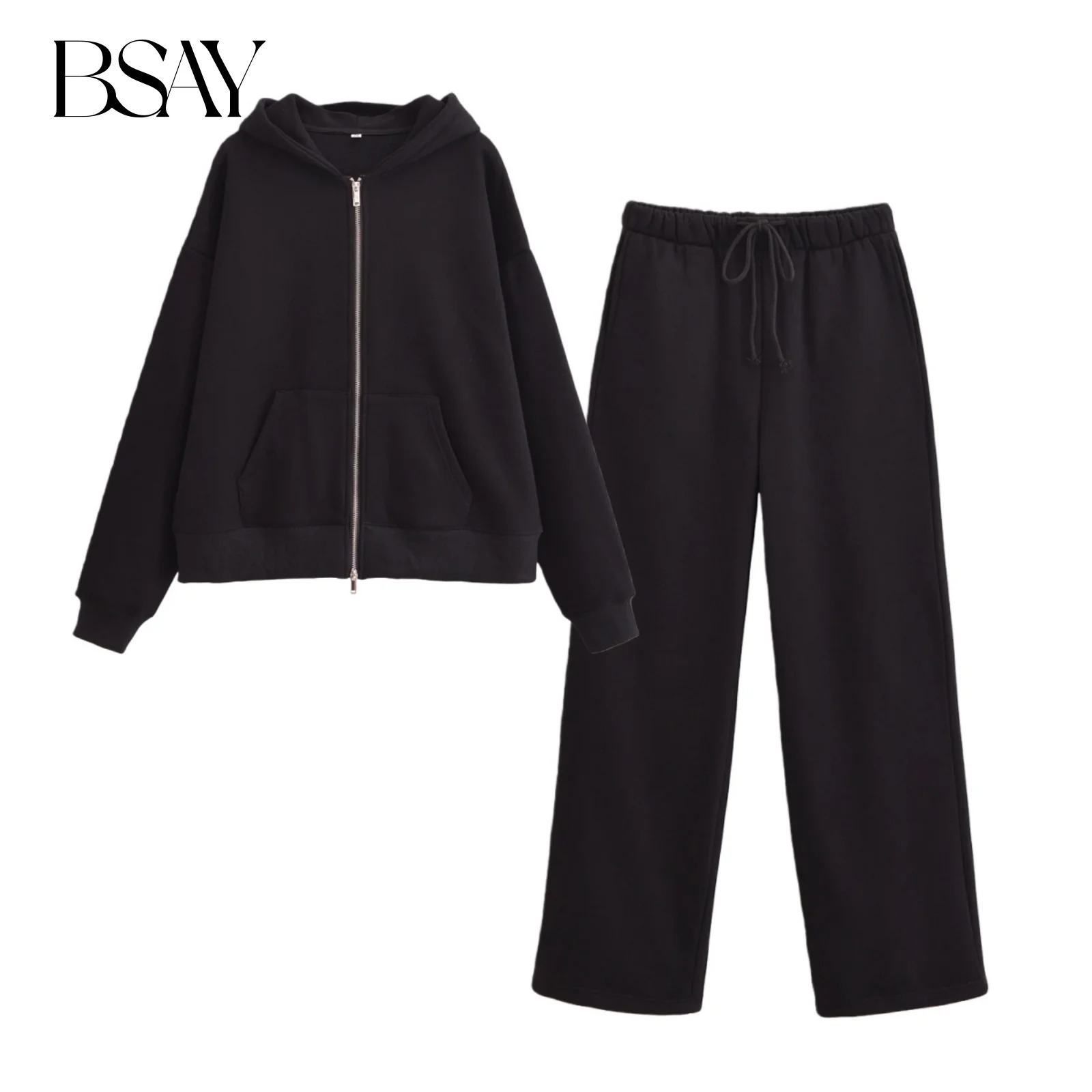 BSAY Women Fashion Autumn 2pcs Solid Long Sleeved Zip Hooded Sweatshirt Loose Jacket Female Straight Pants Two Piece Set