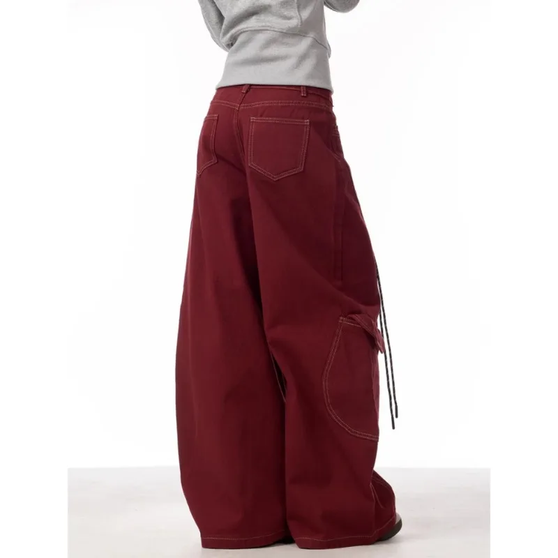 Cargo Red Casual Jeans Womens Workwear Pants Loose Straight Wide Leg Trousers Spring Korean Style Lazy Comfortable Chic