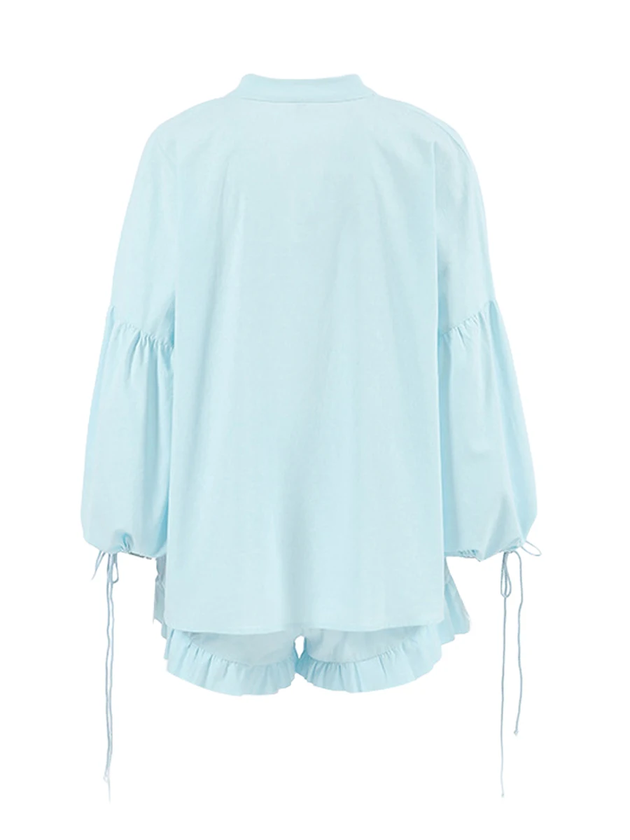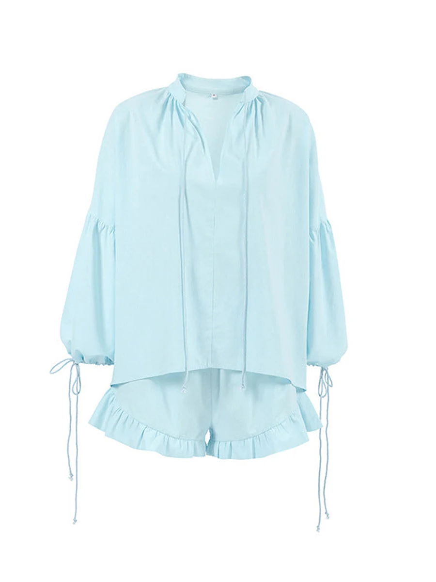Casual Solid Color Slim Fit Two-piece Set Drawstring Long Sleeve Top & Ruffle Hem Elastic Waist Shorts Outfits