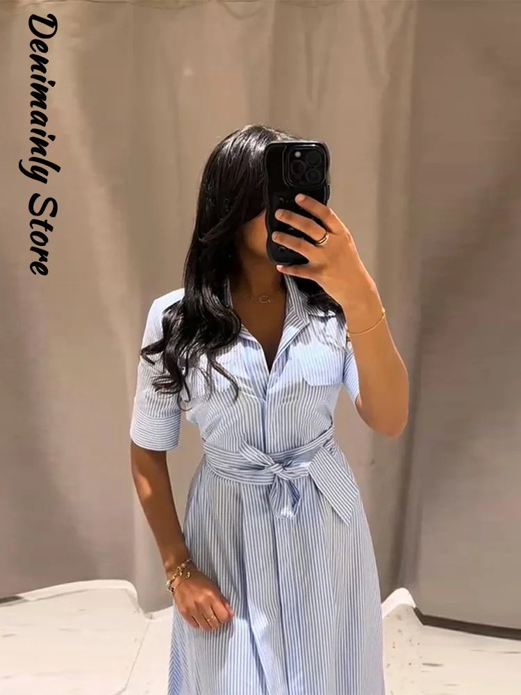 Casual Striped Women Summer Dress Lapel Single Breast Half Sleeve Slim Waist Long Dresses 2025 Autumn Lady Fashion Vacation Robe