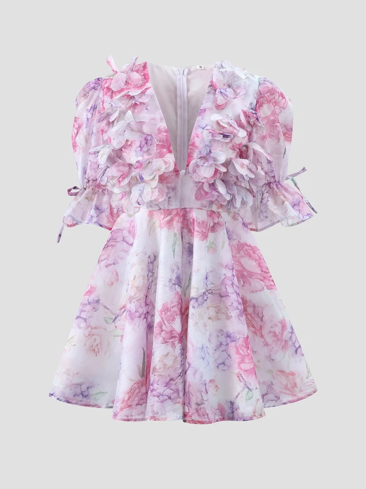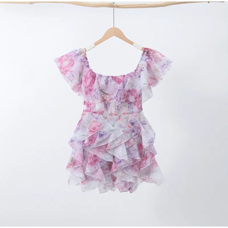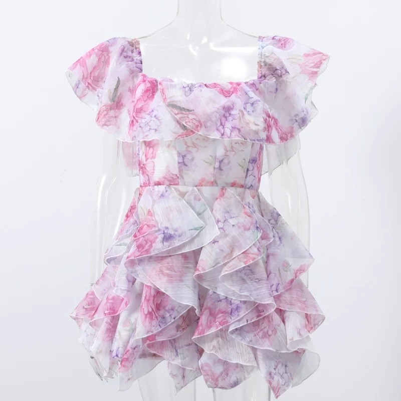 Chic Floral Printed Mini Dress Backless Sleeveless Hem Stacking Dresses Sweet A Line Vestidos 2025 New Lady Party Club Clothing