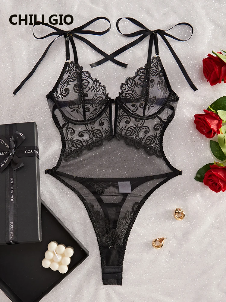 CHILLGIO Women Lace Embroidery Bodysuit Sexy Underwear Overalls Bodycon Erotic One Piece Sleepwear Lace Up Chic Strappy Jumpsuit