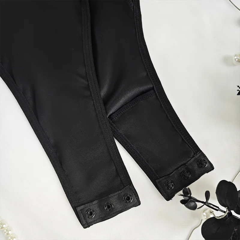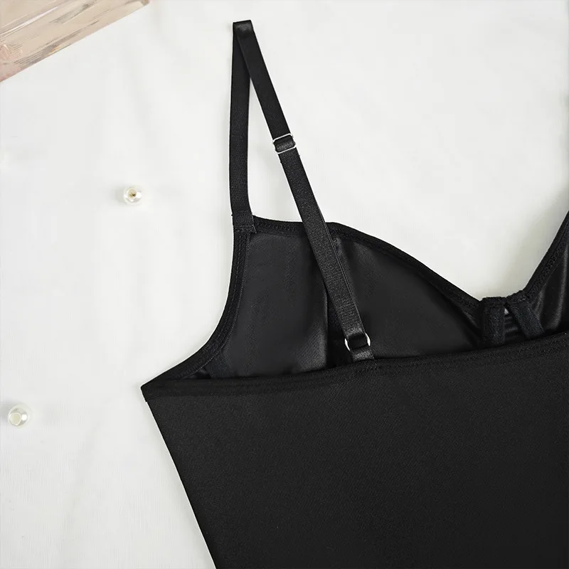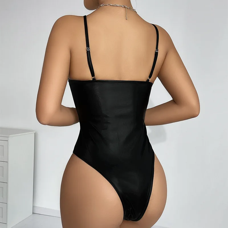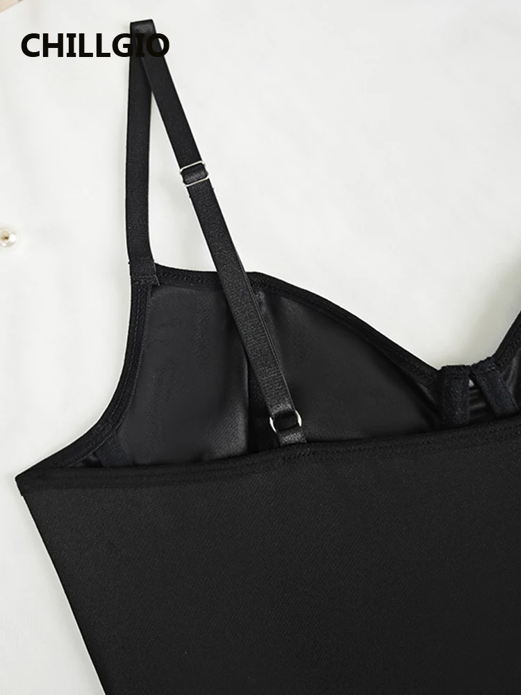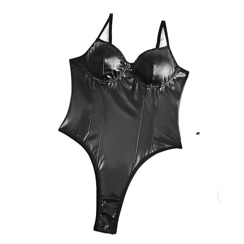 CHILLGIO Women PU Patchwork Black Bodysuit Push Up Spaghetti Straps Romper Sexy Lingеrie Club Tight Jumpsuit Top Hot Sexy Onesie