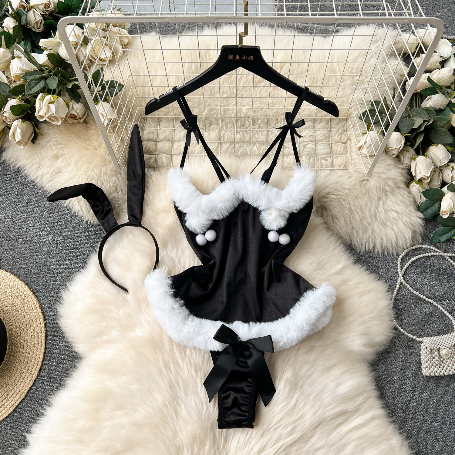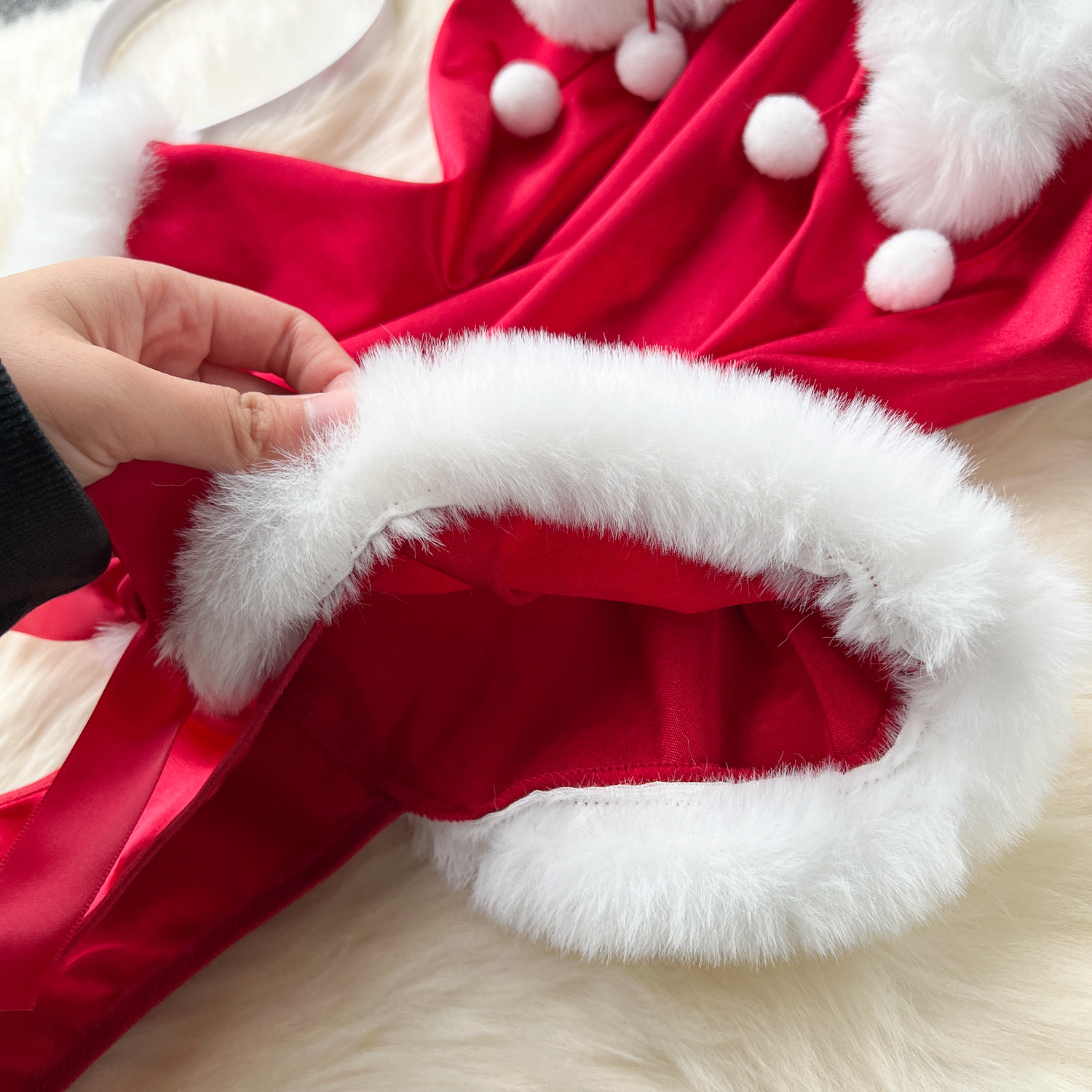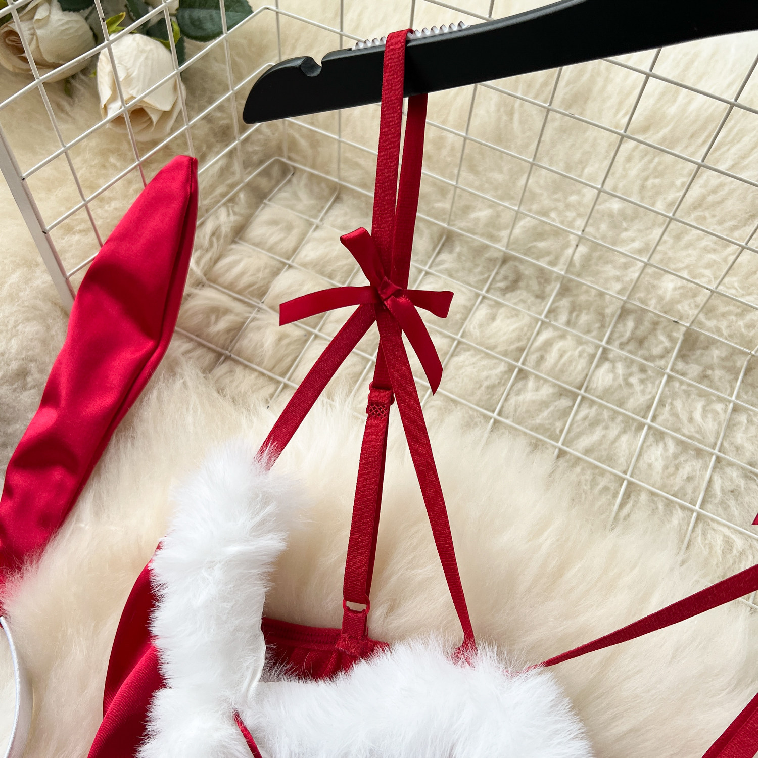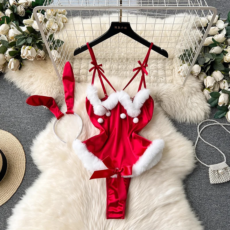 CHILLGIO Women Sexy Christmas One Piece Bodysuits Satin Tight Onesie Hot Bunny Catsuits Fashion Fur Combination Strappy Rompers