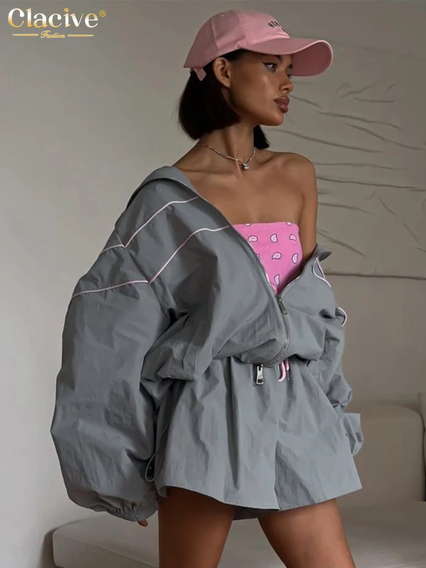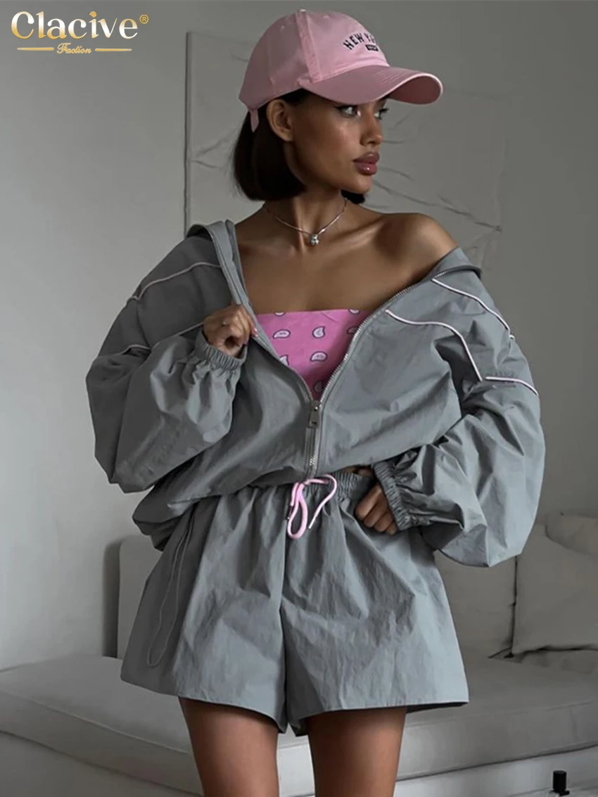 Clacive Fashion Loose Gray 2 Piece Sets Women Outfit 2024 Elegant Long Sleeve Shirt With High Waist Shorts Set Female Streetwear
