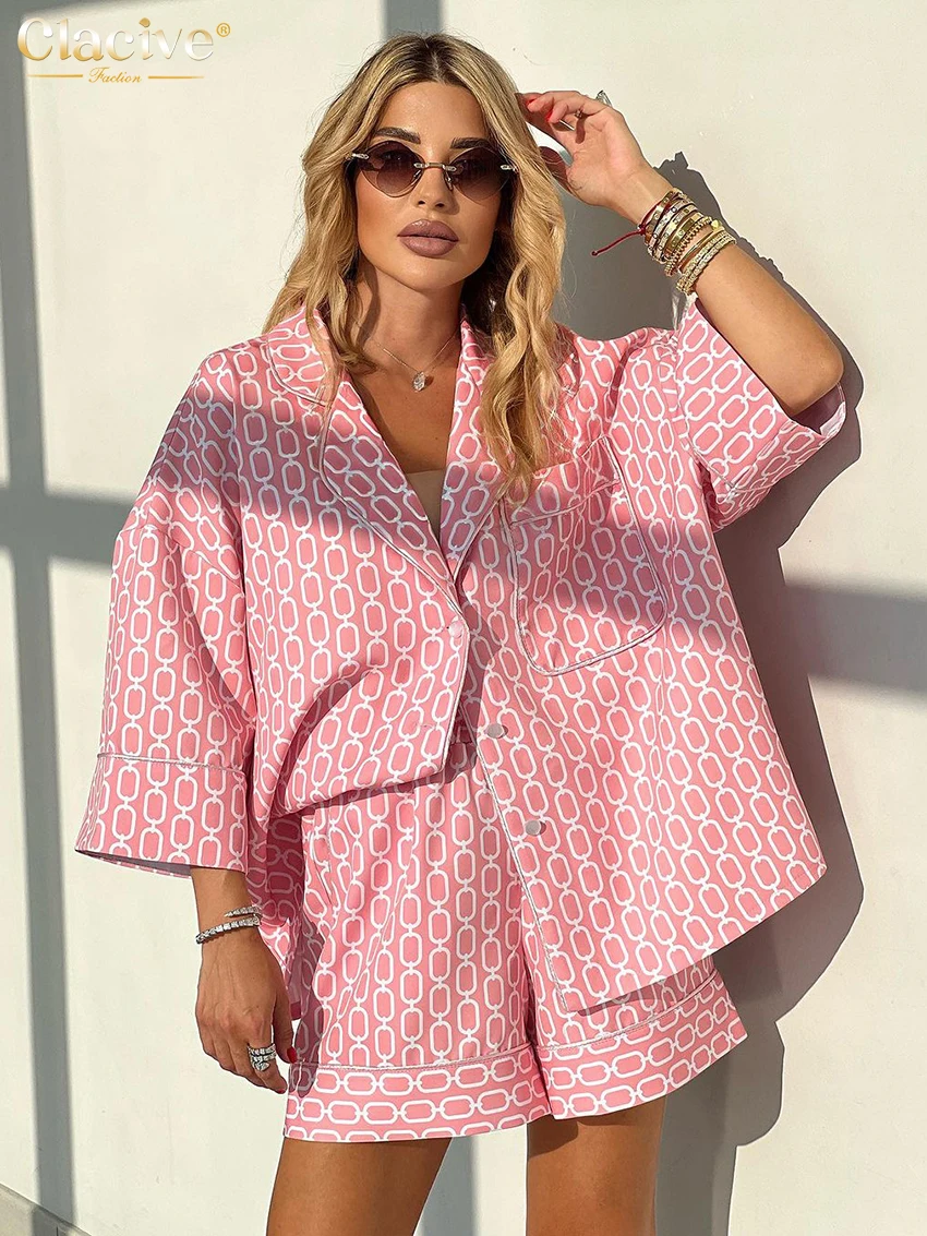 Clacive Fashion Loose Print 2 Piece Sets Women Outfit 2024 Casual Long Sleeve Shirt With High Waist Shorts Set Female Homewear