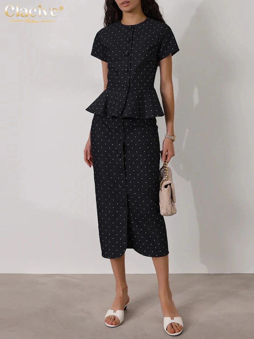 Clacive Summer Slim Print Skirts Set 2 Piece Woman 2025 Fashion Short Sleeve Shirt With High Waist Midi Skirt Set Streetwear