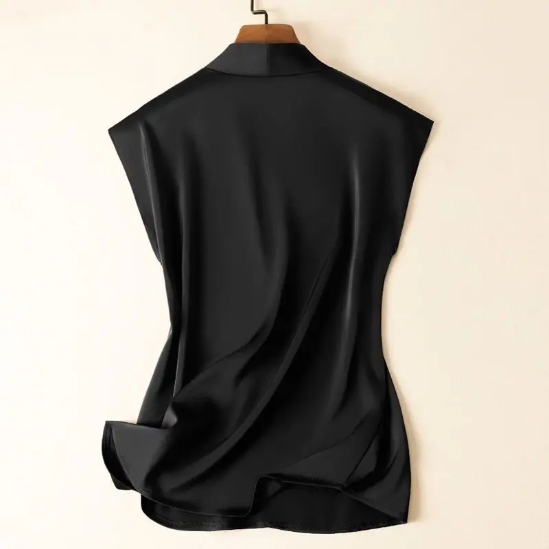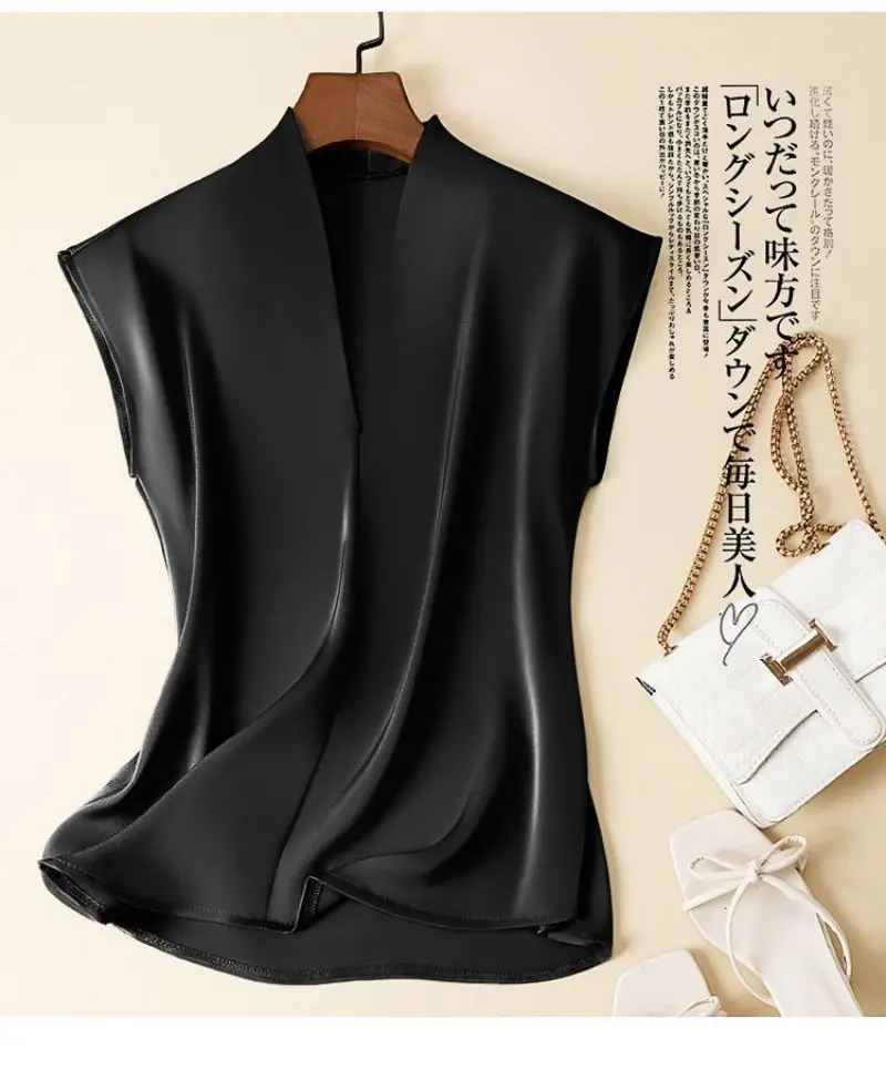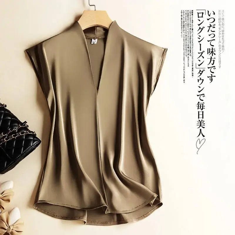 Coffee Silk Rayon V-Neck Pullover Sleeveless Casual Chic Women’s Blouse Shirt Korean Fashion Female Clothing 2024 Summer
