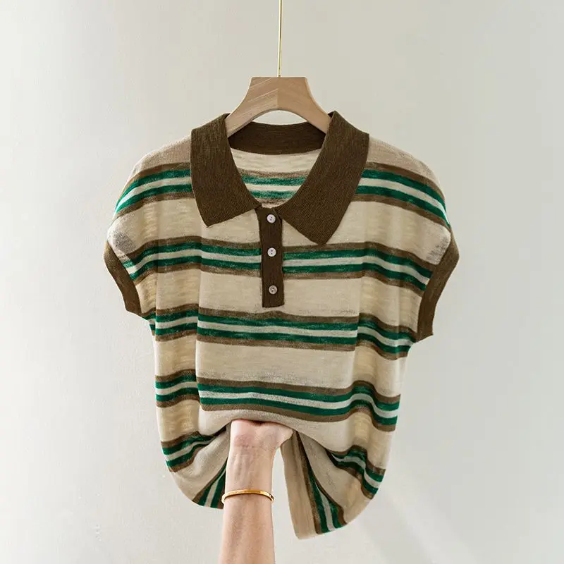 Contrasted Striped Lapel Short-sleeved T-shirt for Women in Summer Loose Casual and Versatile POLO Shirt