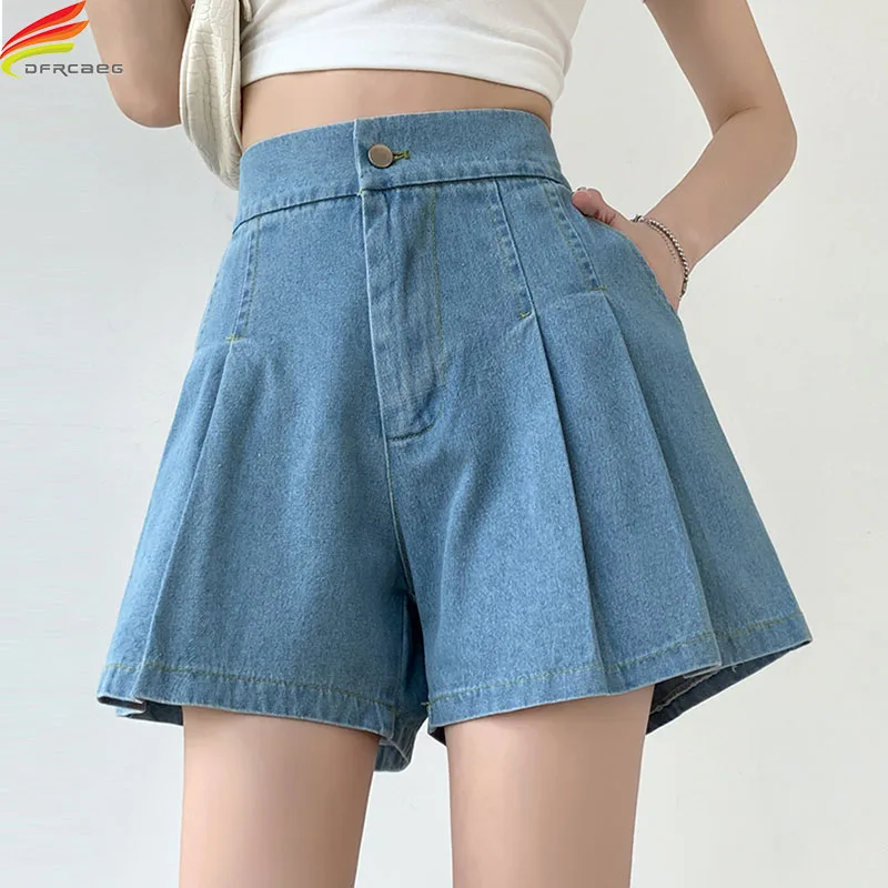 DFRCAEG 2024 Summer Plus Size Denim Shorts For Women High Elastic Waist Blue Or Sky Blue Pleated Mini Large Size Short Femme
