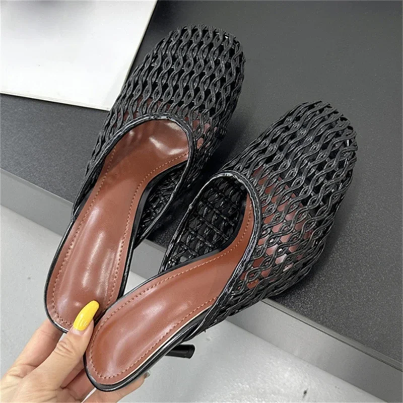 Eilyken Summer Hollow Out Breathable Mesh Weaving Women Slippers Fashion Thin Heels Party Dress Mule Shoes Large Size 43