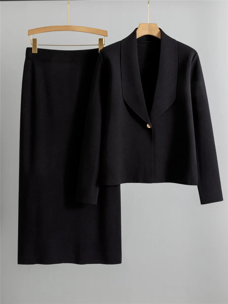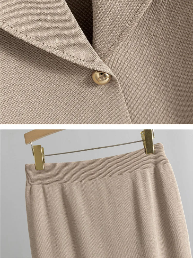 Elegant Chic Knitted 2 Piece Sets Women Lapel Neck Long Sleeve Knitwears Cardigan Tops Conjuntos Solid High Waist Skirts Outfit