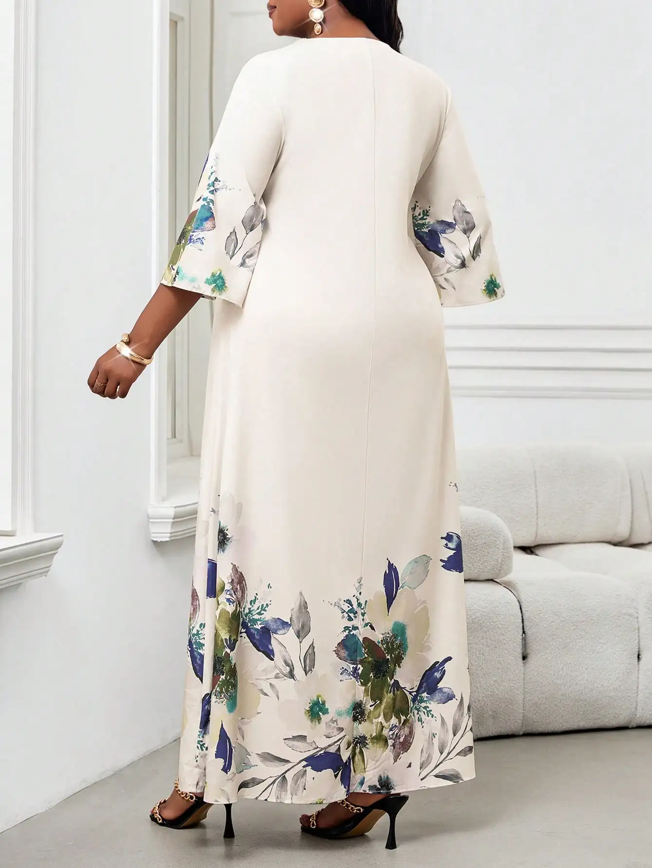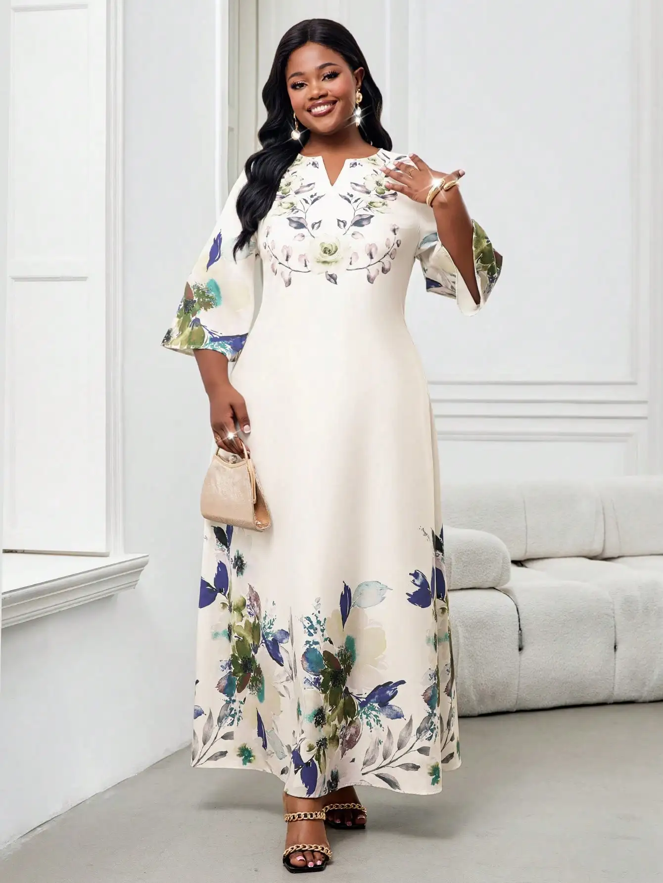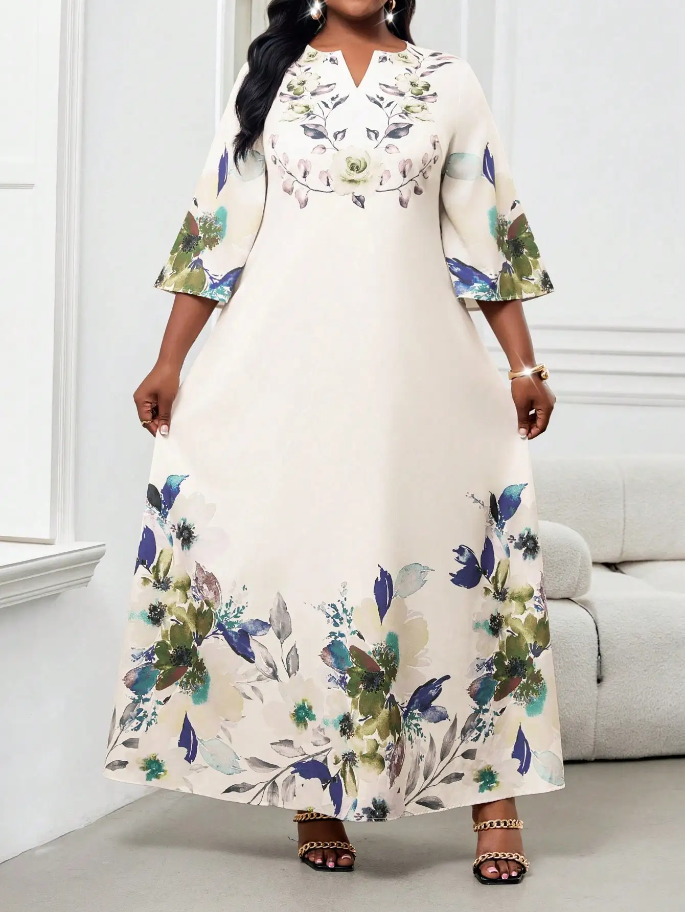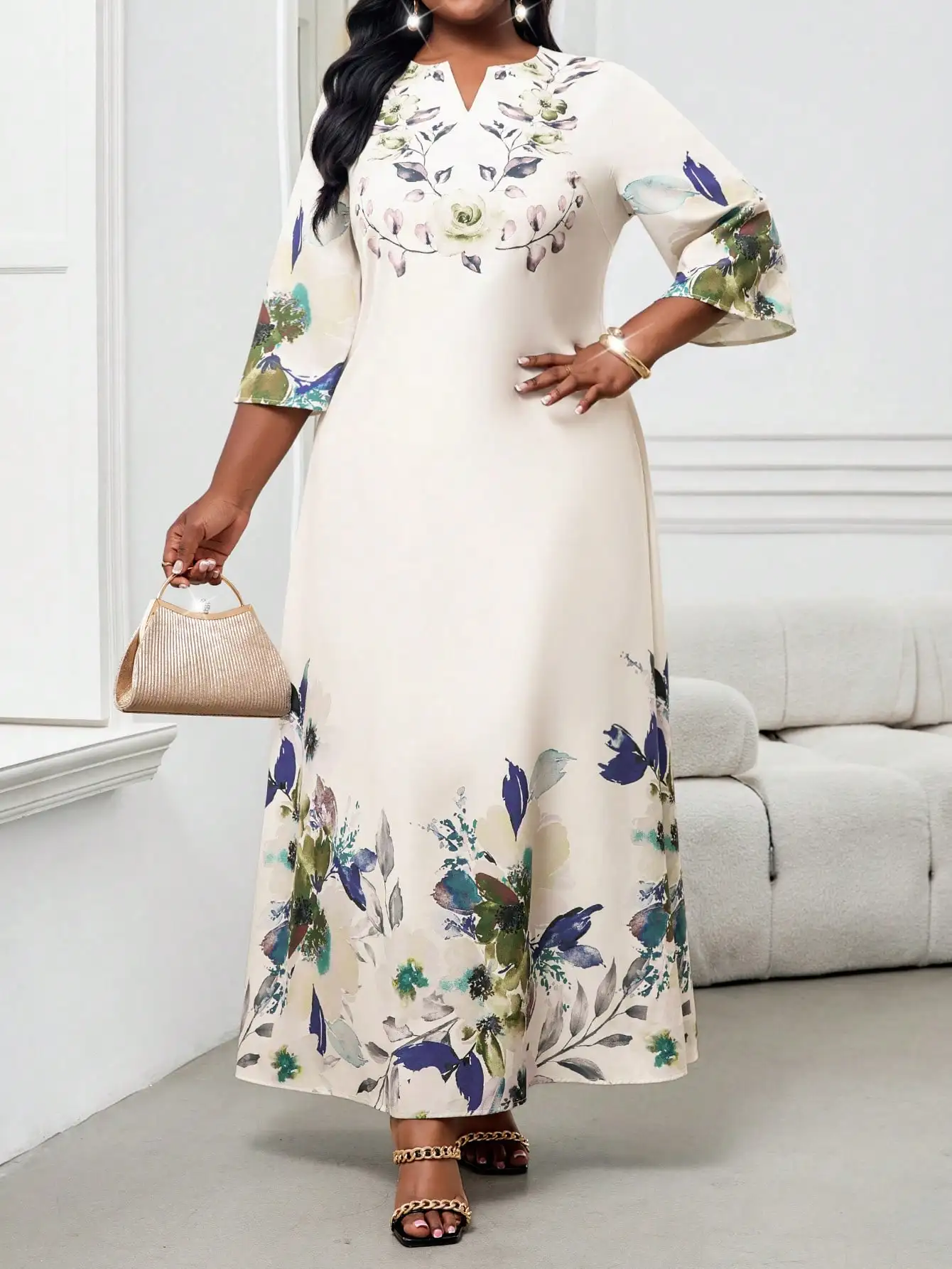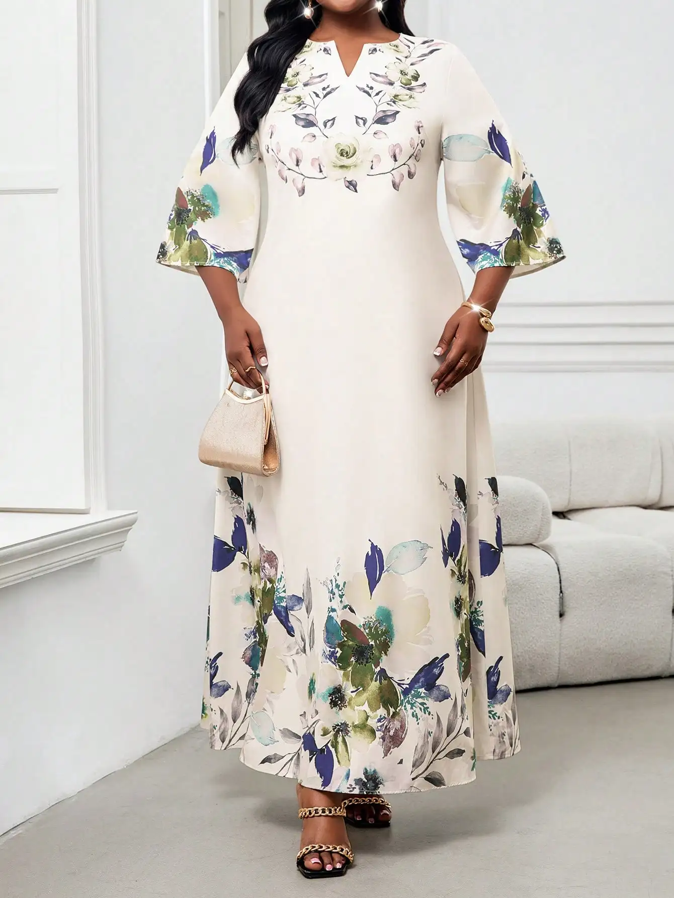 Elegant Floral Maxi Dress for Women, Plus Size V-Neck Bell Sleeve Summer Dress for Wedding Guest or Office