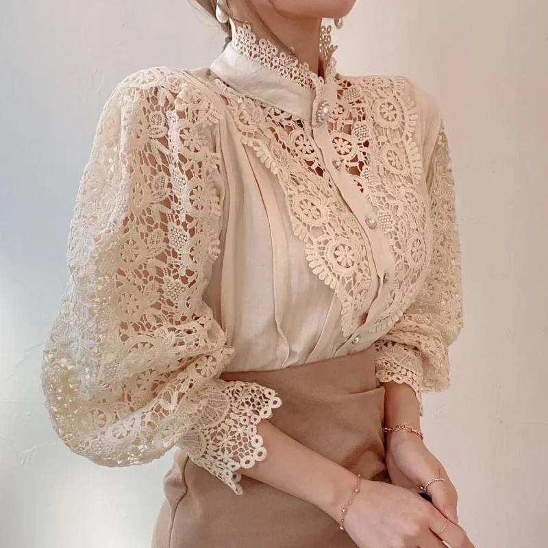 Elegant Loose Sweet Fashion Lace Women Blouse Office Stand Collar Casual Shirt Ladies Petal Long Sleeves Hollow Out Top Clothing