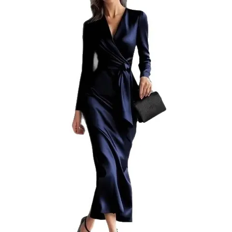 Elegant Solid Color Slim Banquet Dress Casual Lady Long Sleeve Wrap Hips Party Dress Sexy V-neck High Waist Lace Up Satin Dress