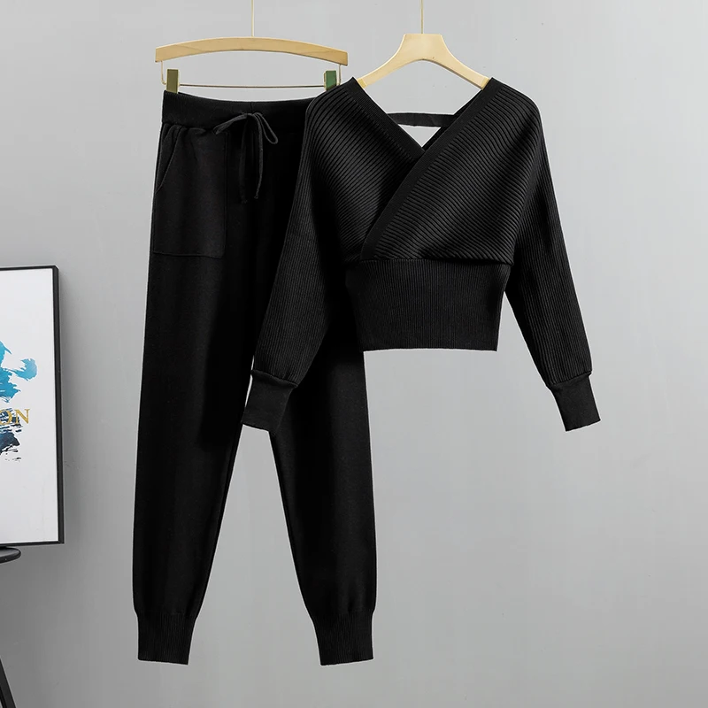Elegant Tracksuit Sexy Two Piece Set Women Korean Style Ribbed Knitted Backless Top And Long Harem Pant Suit Autumn Outfits y2k