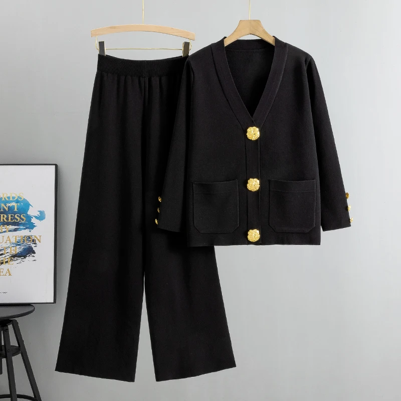 Elegant V-neck Long Sleeve Sweater Cardigan +wide Leg Pants 2 Piece Sets Womens Spring Solid Color Casual Sweatshirts