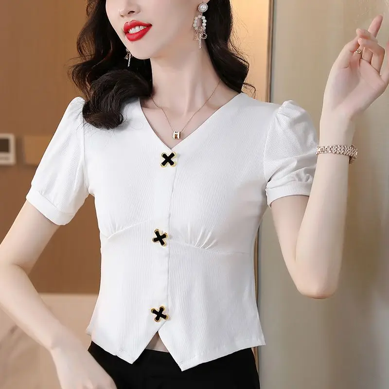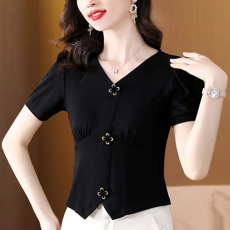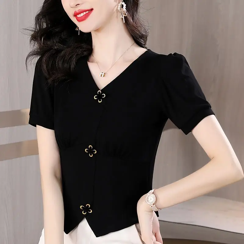 Elegant Women All-match Irregular T-shirt Summer Tees French Fashion Office Lady Solid Chic Cross Button Short Sleeve Slim Tops