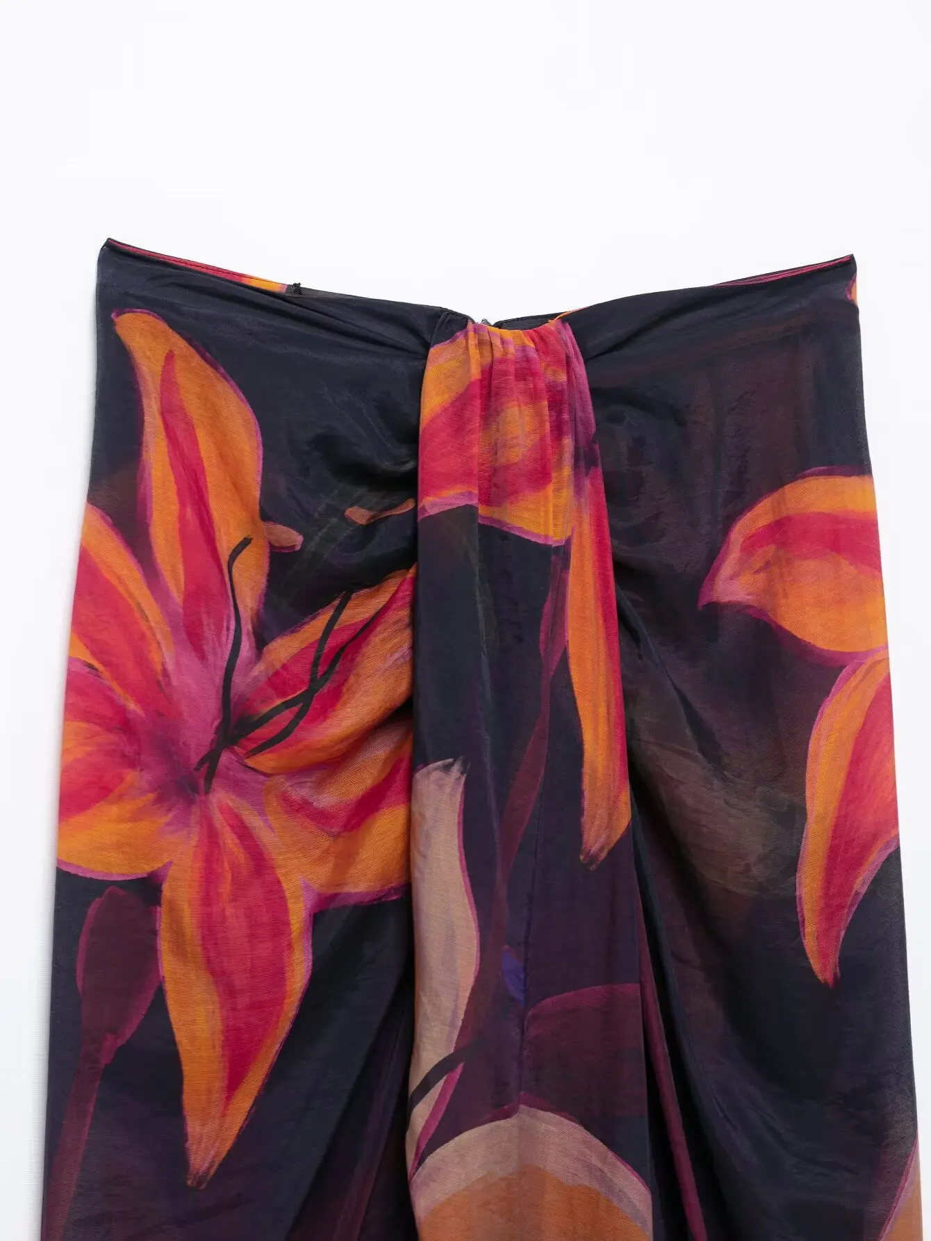 Elegant Women Bohemian Style Floral Print Front Knotted Slim Wrapped Skirt Faldas Mujer Female Summer Zipper Midi Skirts QUN2612