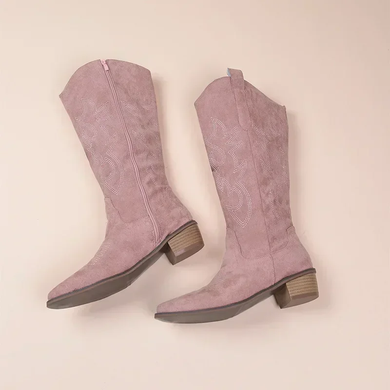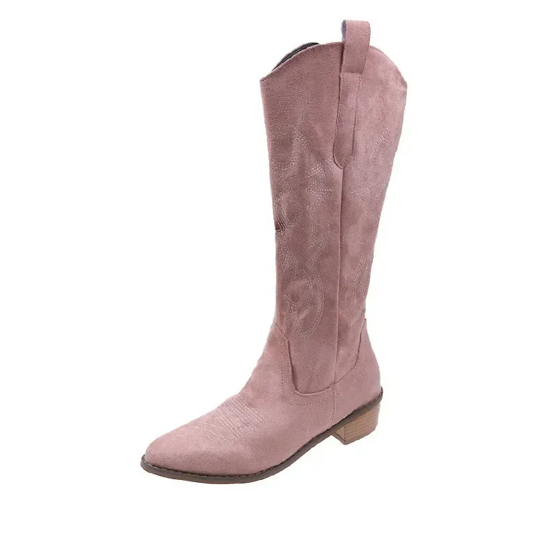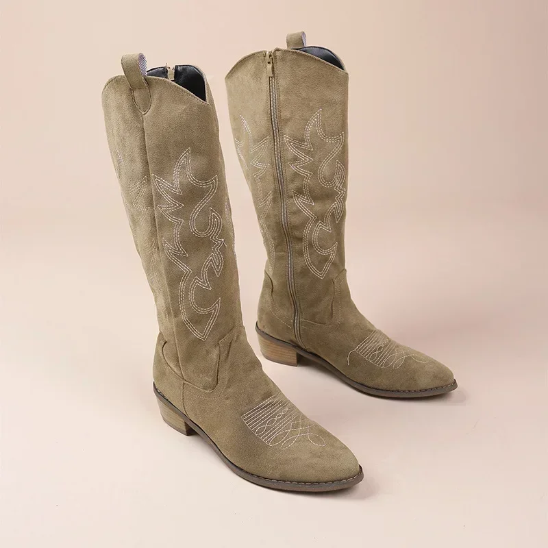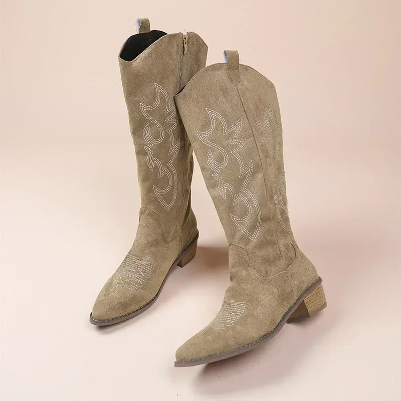 Embroidered Western Cowboy Boots for Women Autumn Pointed Toe Thick Heel High Knee Boots Woman Loose PU Leather Long Botas Mujer