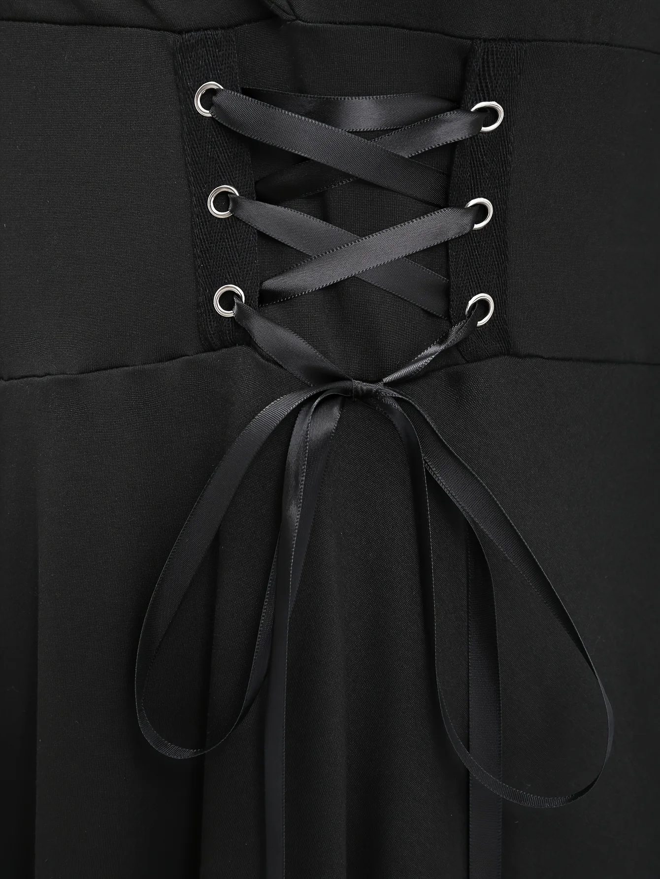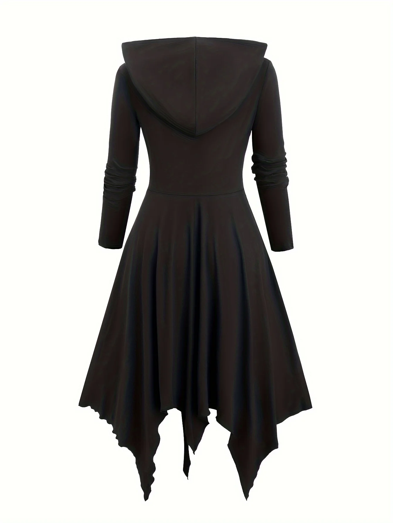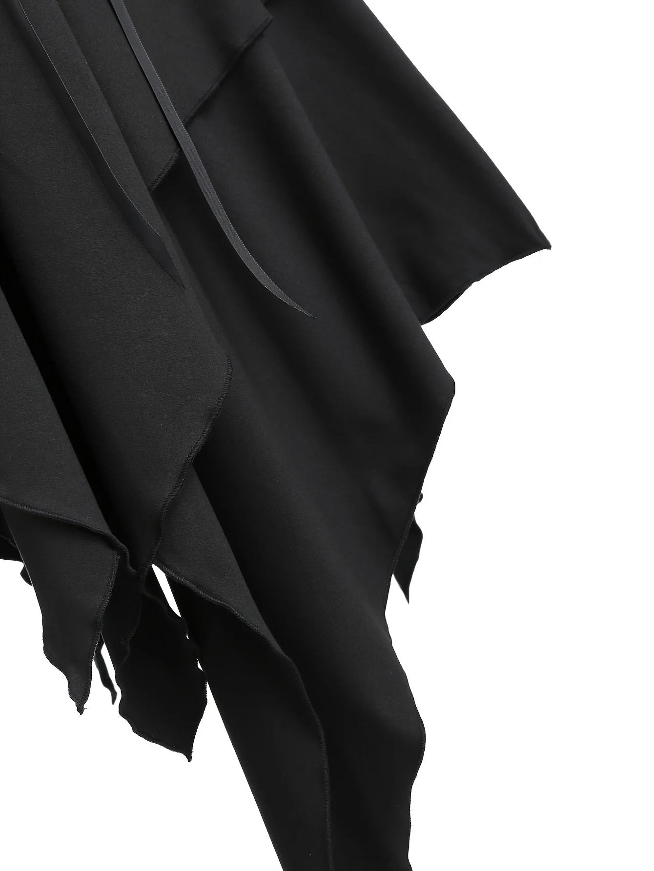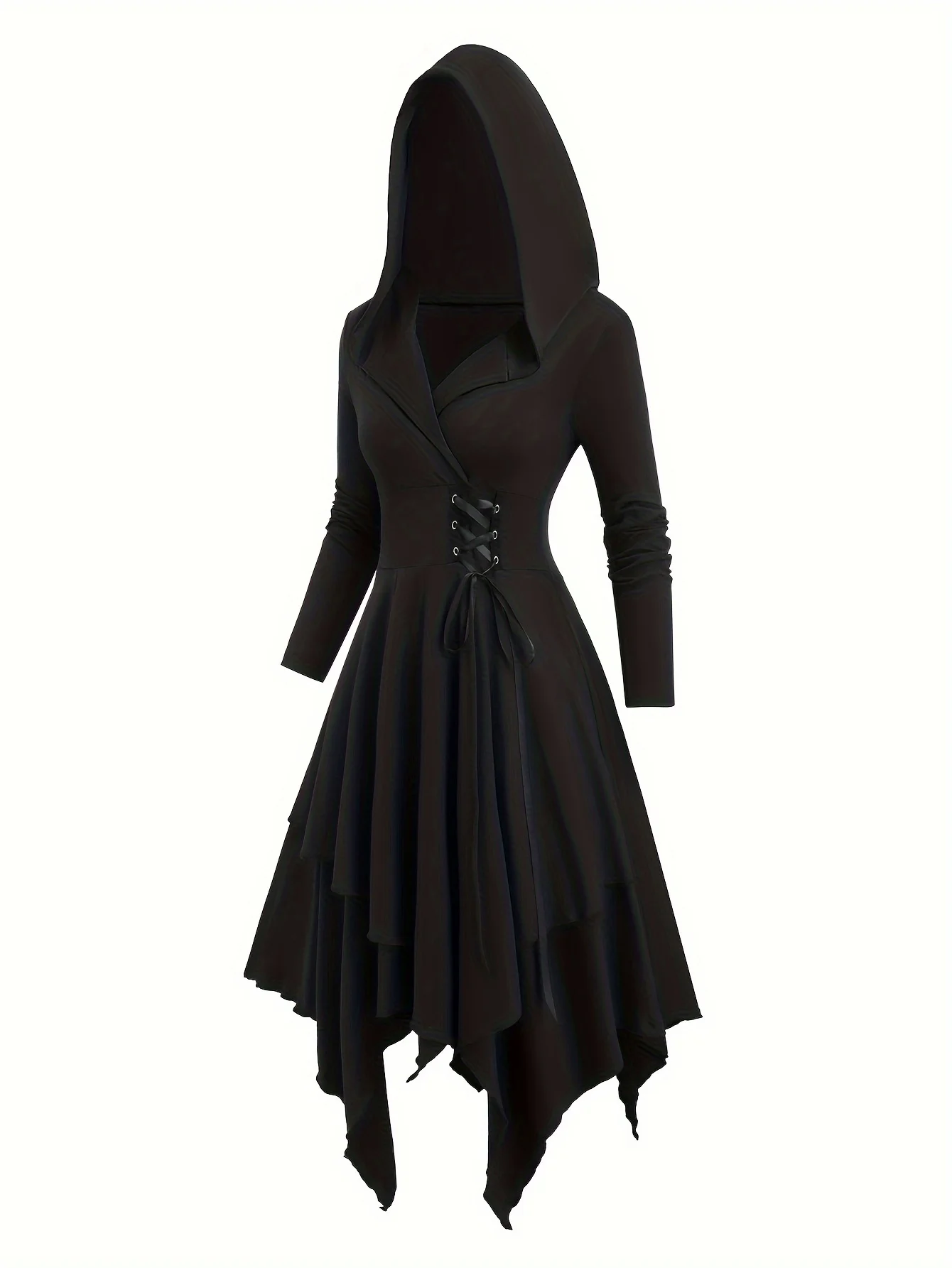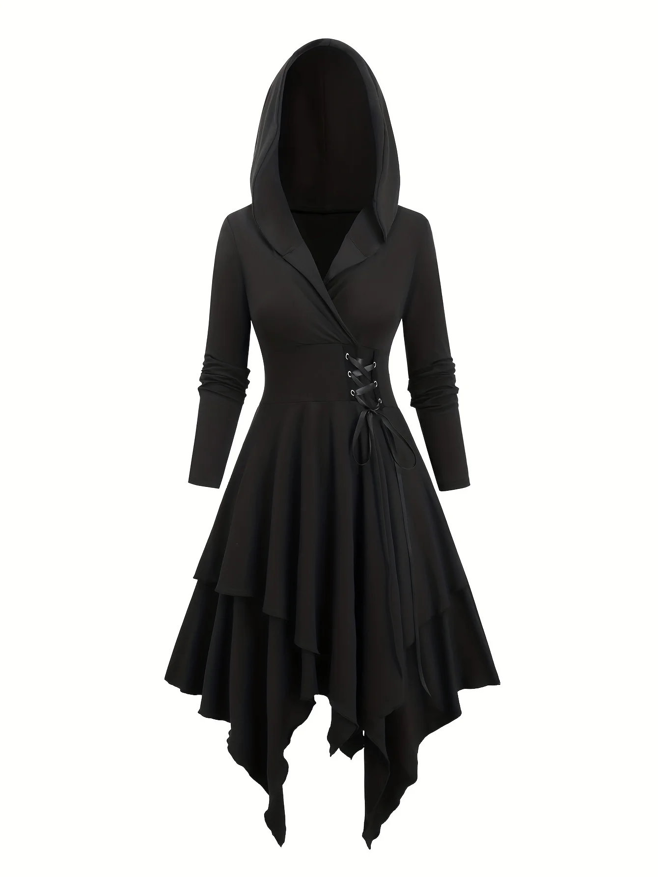 European and American fashion plus size long sleeve Gothic lace-up hooded irregular dress pure black handkerchief hem.