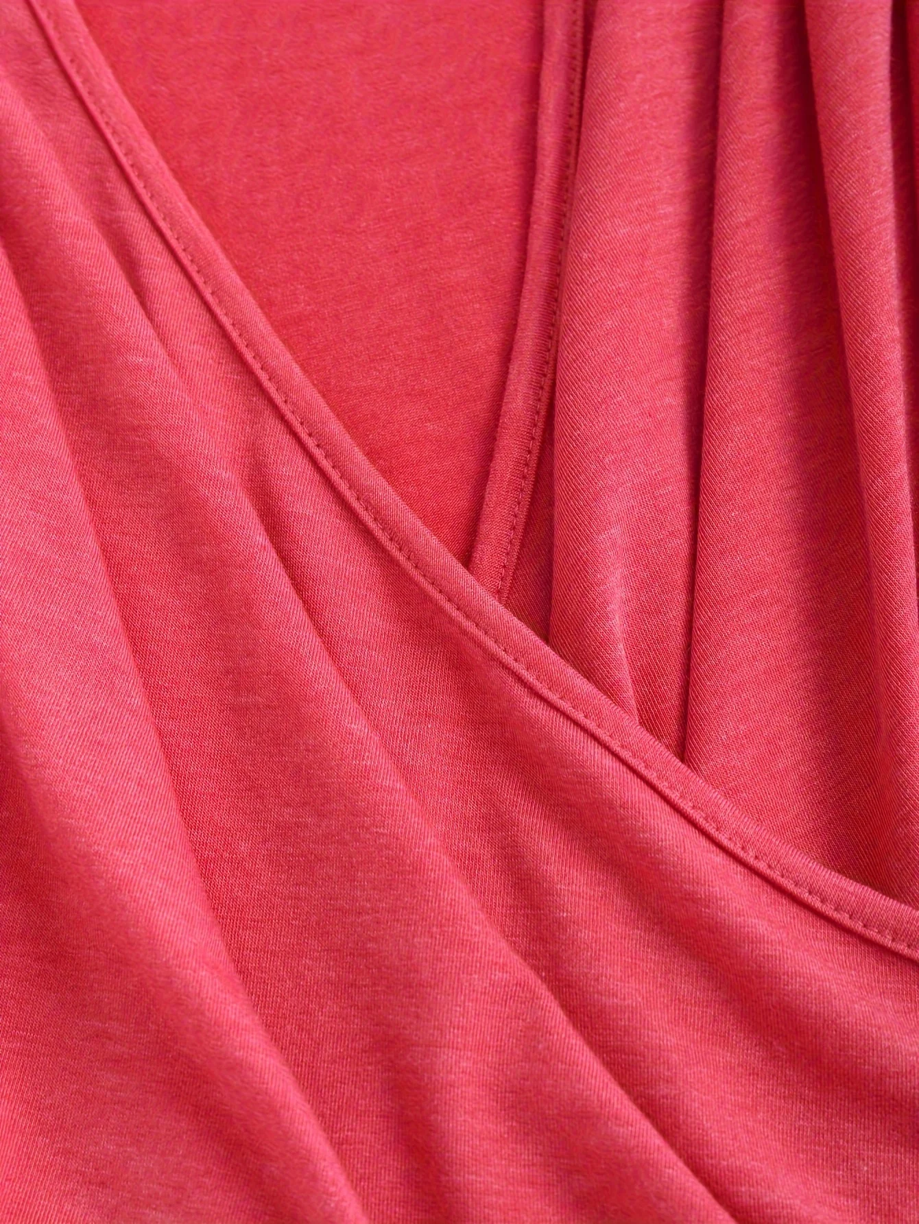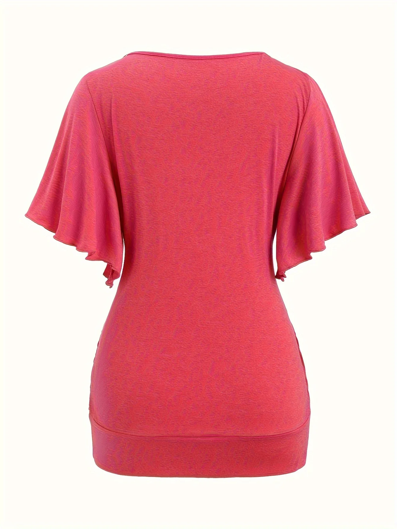 Featuring a chic V-neck and lettuce pleated detailing, this T-shirt adds a touch of elegance to any outfit.