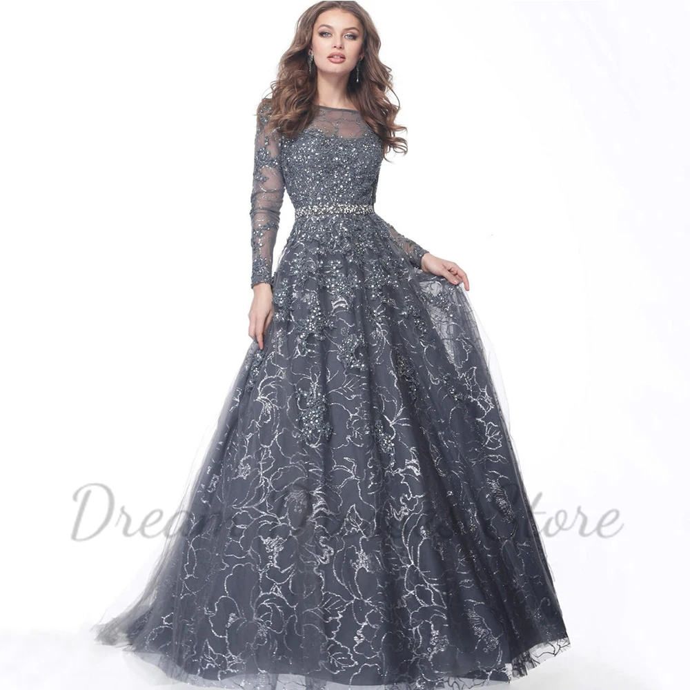 Exquisite Shiny Lace A-Line Prom Dress Scoop Neck Long Sleeves Illusion Tulle Women Floor Length with Beading Belt Party Gowns