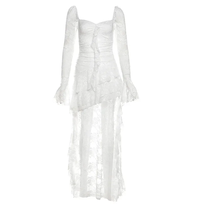 Fairycore Lace Flare Sleeve Square Neck A-line Dress Sweet E-girl Irregular Long Hem Dresses Cyber Y2K Party Vestido