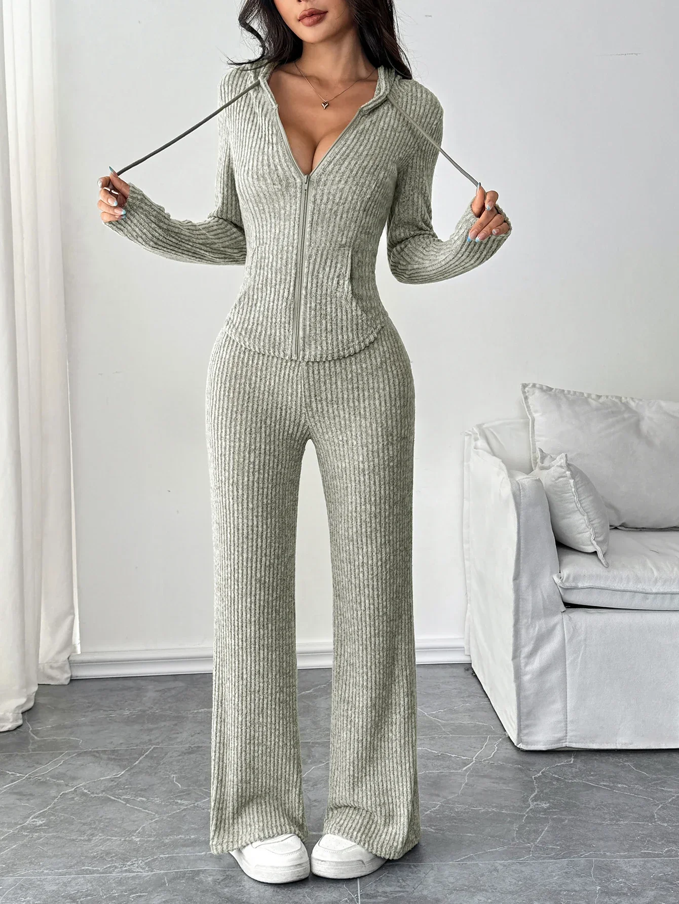 Fashionable Casual Women’s Solid Color Hooded Zipper Top And Loose Flared Pants Set Streetwear Style Comfortable Outfit