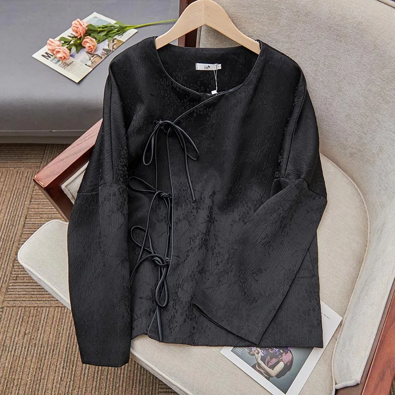 Fashionable Chinese Style Jacquard Shirt Jacket Women’s Top Round Neck Long Sleeve Lace-up Buckle Vintage Loose Blouse Coat