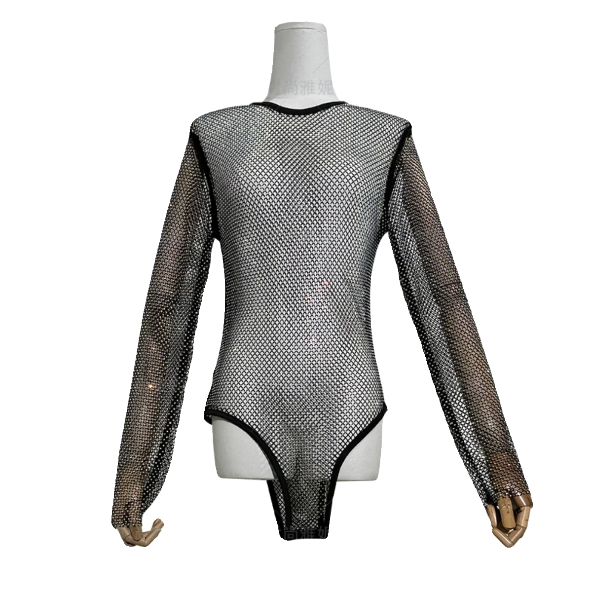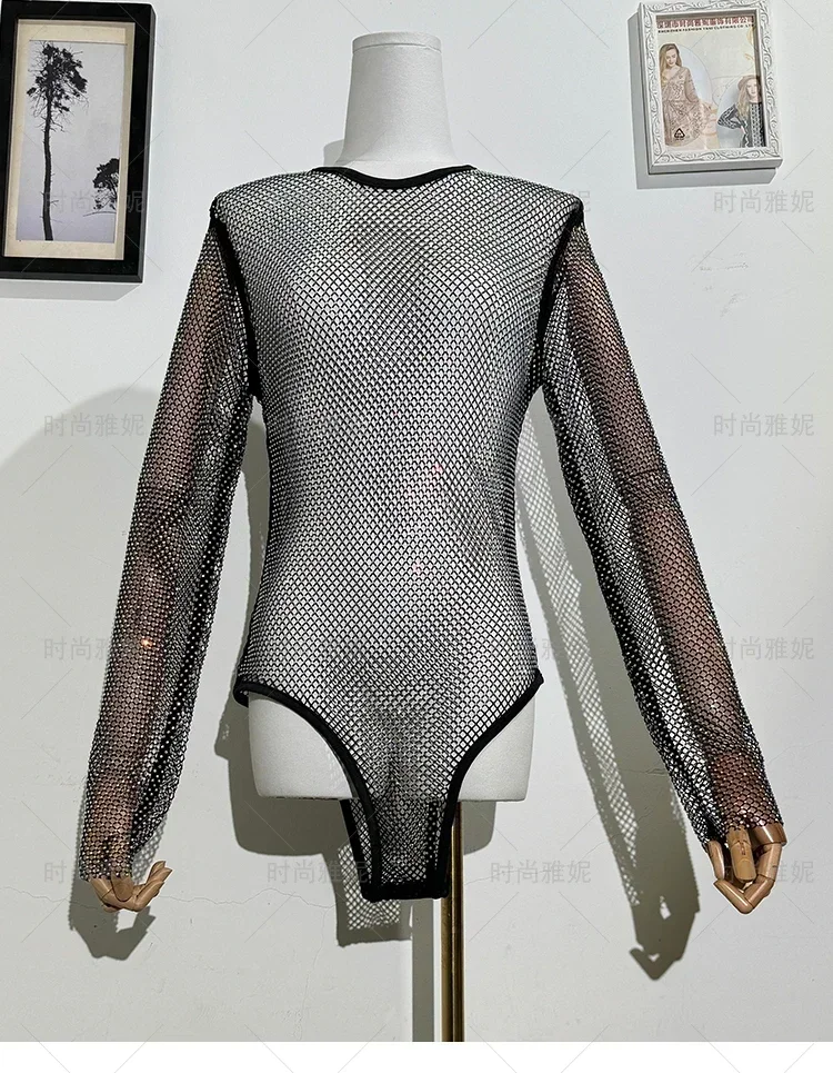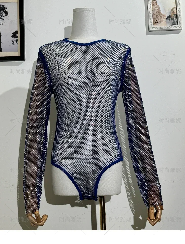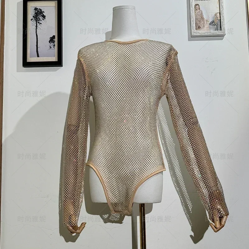 Fashionable Sexy Performance Clothes Mesh Hollow Jumpsuit Round Neck Perspective Long Sleeve Sparkling Bottoming Shirt for Women