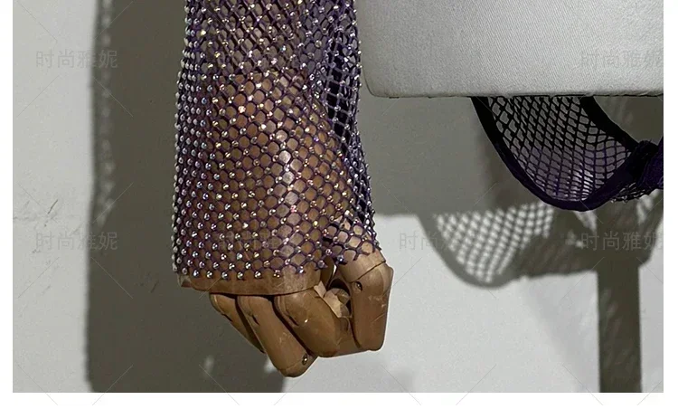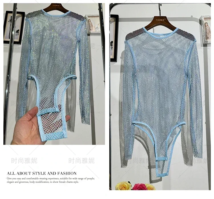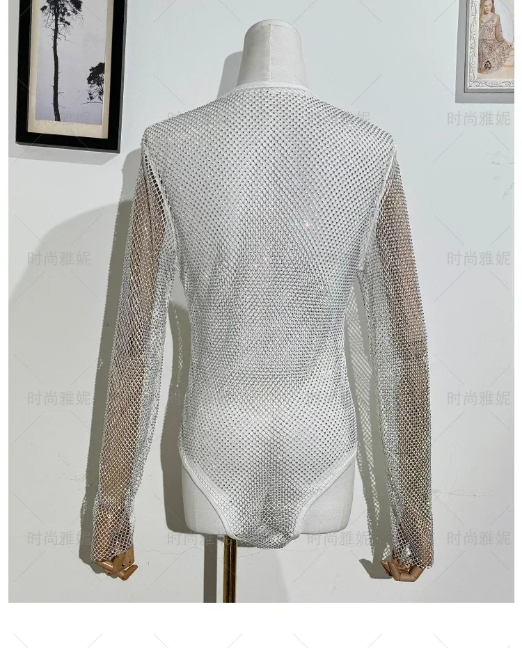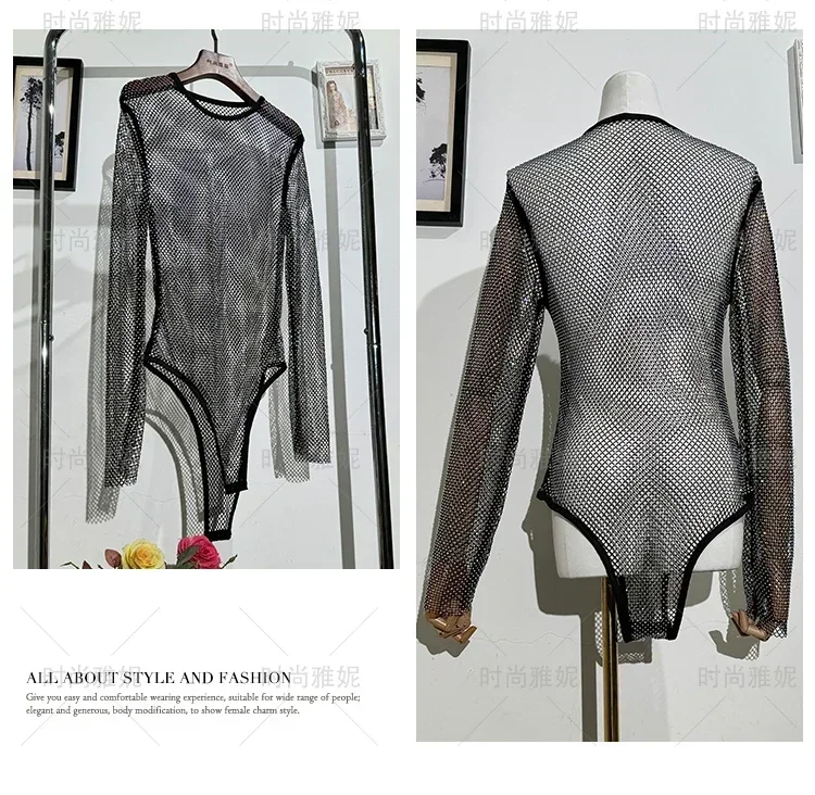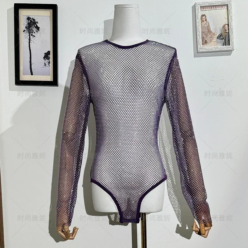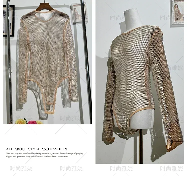 Fashionable Sexy Performance Clothes Mesh Hollow Jumpsuit Round Neck Perspective Long Sleeve Sparkling Bottoming Shirt for Women