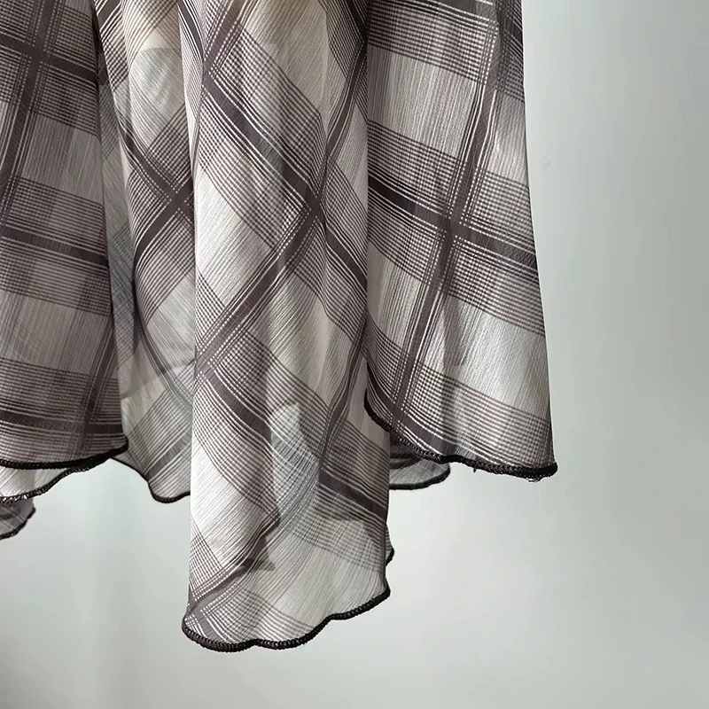 Flowing Check Midi Skirt 2026 Spring Summer New Retro Long Skirt Seaside Holiday Casual Brown Women Clothing