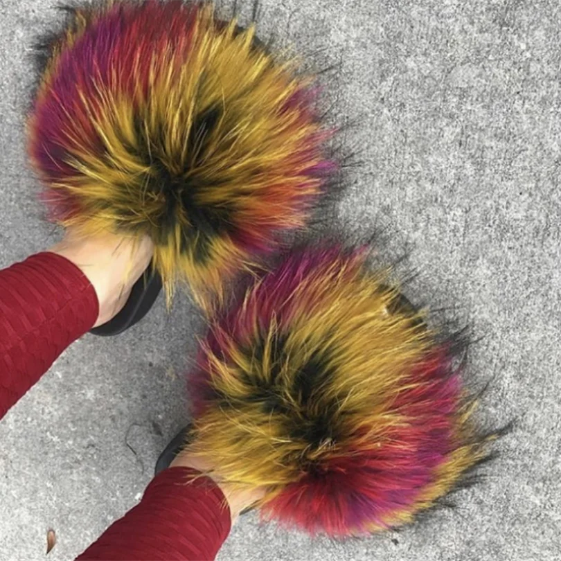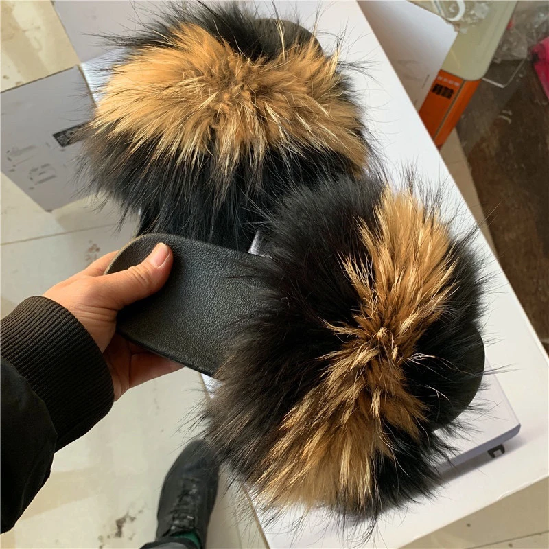 Fluffy Furry Fur Slippers Real Fox Fur Slides For Women Summer PVC Sole Flip Flops Sandals Woman Open Toe Shoes Slippers