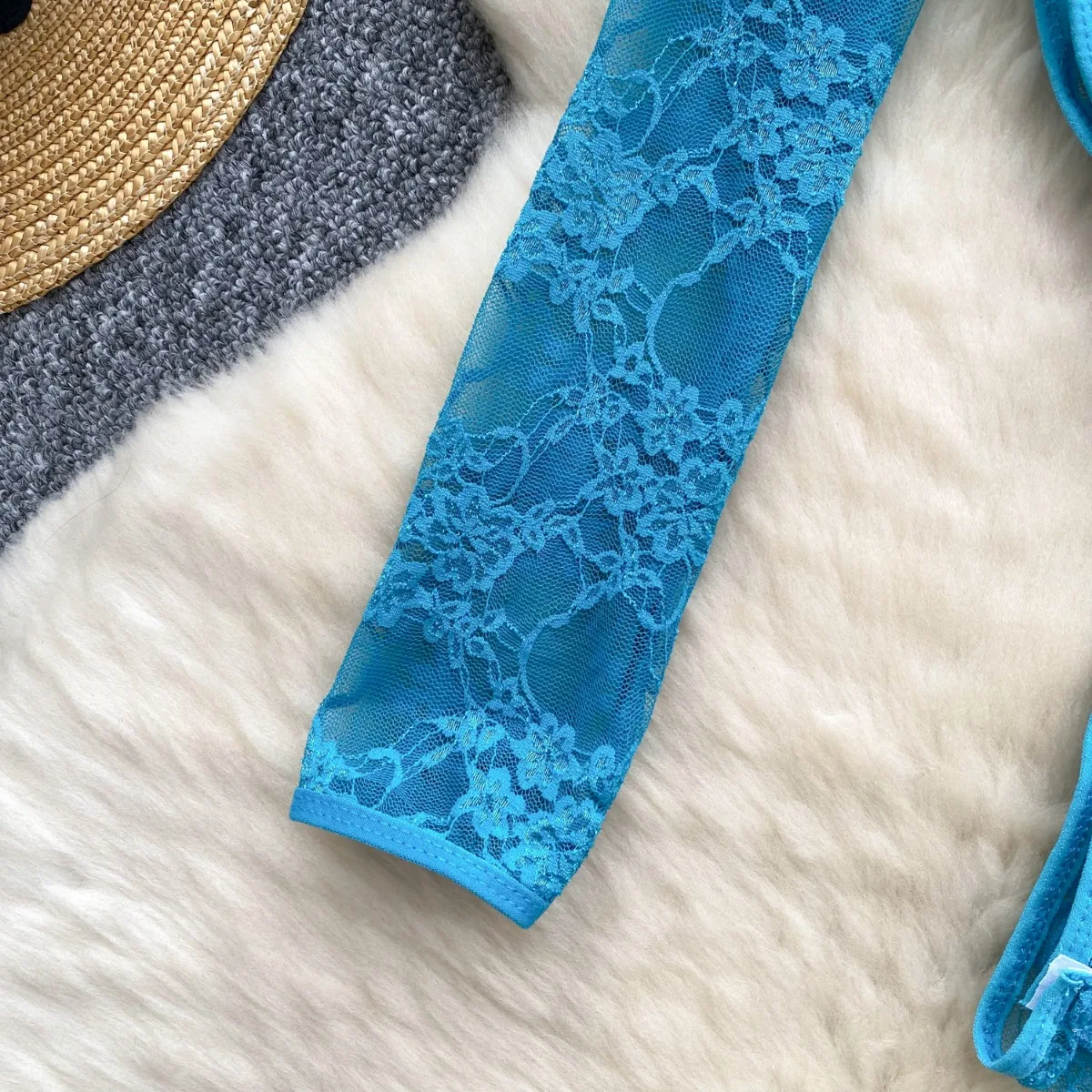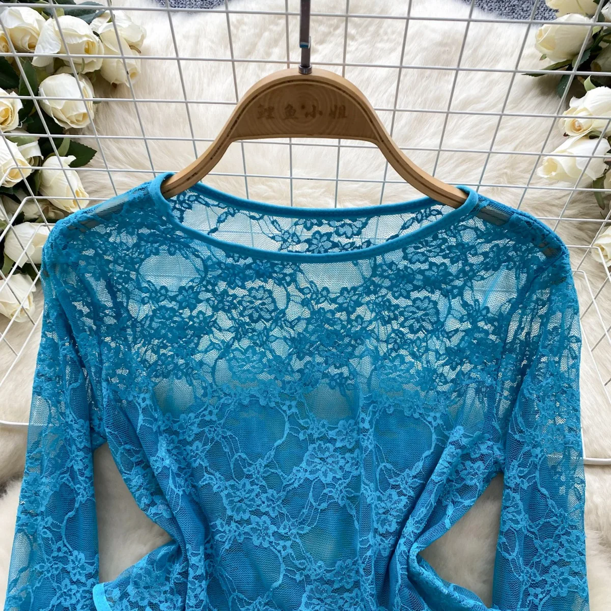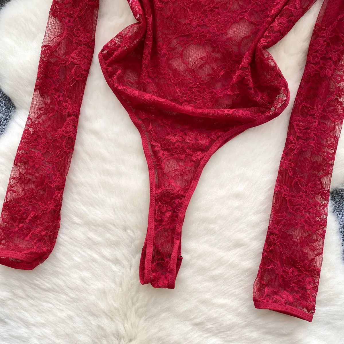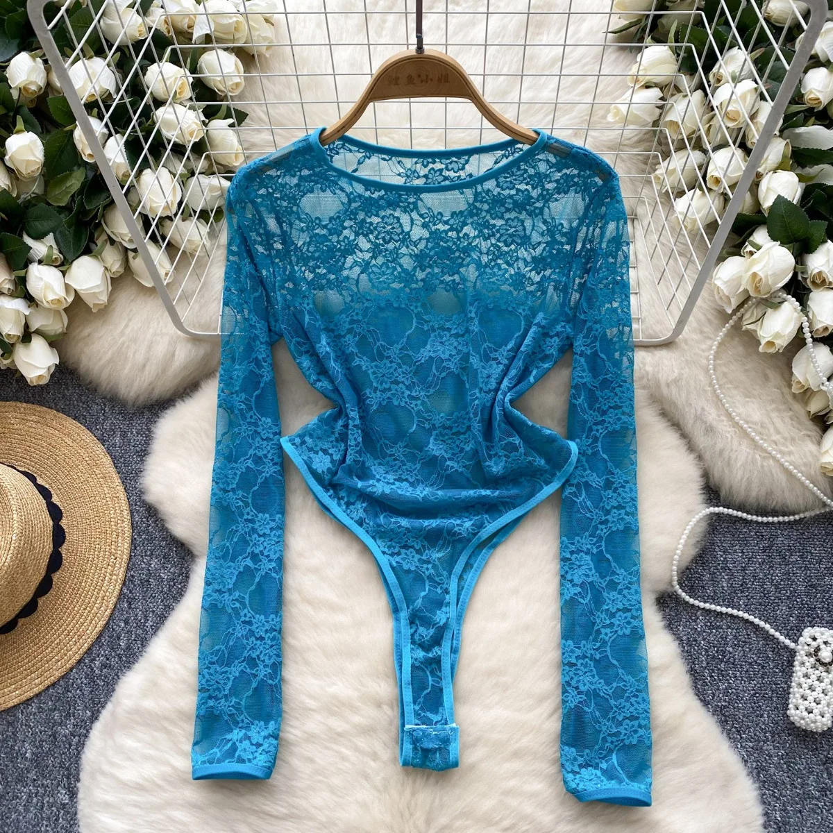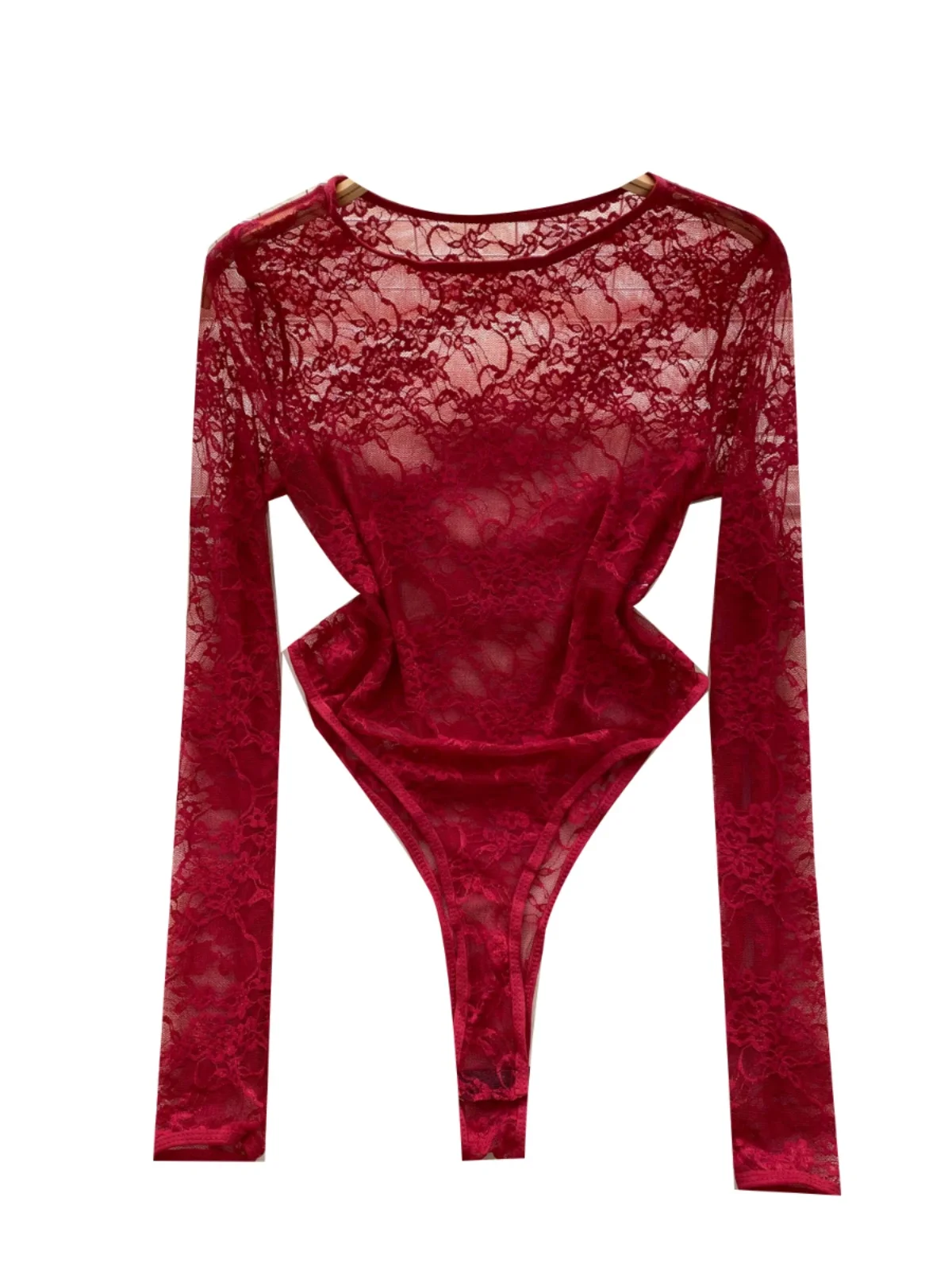 Foamlina American Women’s Clothing Sexy Perspective Crochet Lace Bodysuit Women’s Elastic Slim Inside Long-sleeved Top T-shirt