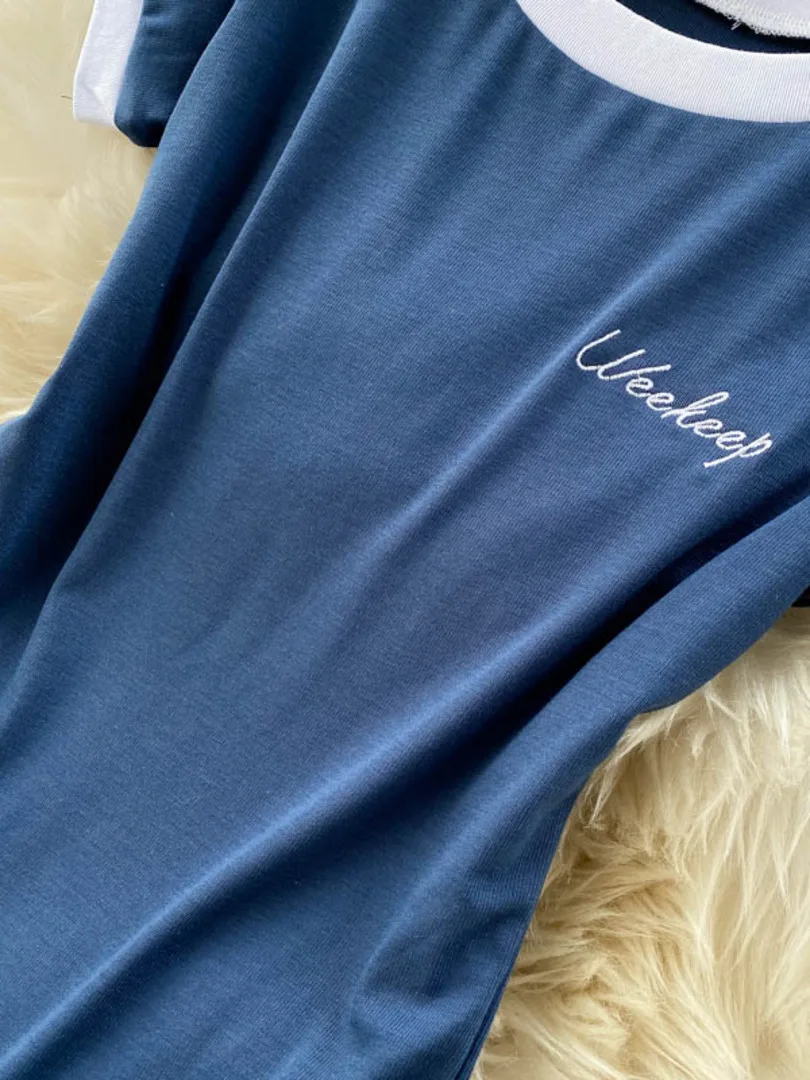 Foamlina Short Sleeve Knitted Skinny Bodysuit Women Summer Fashion Color Block Letters Embroidery O-neck Slim Body Top Jumpsuit