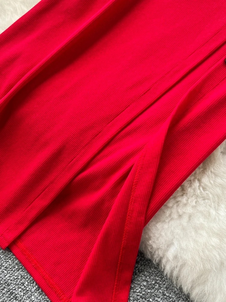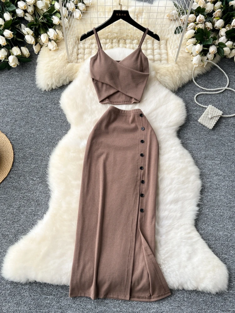 Foamlina Summer Sexy 2 Pieces Set for Women Solid V Neck Sleeveless Crop Camis Top and High Elastic Waist Split Long Skirt Suits