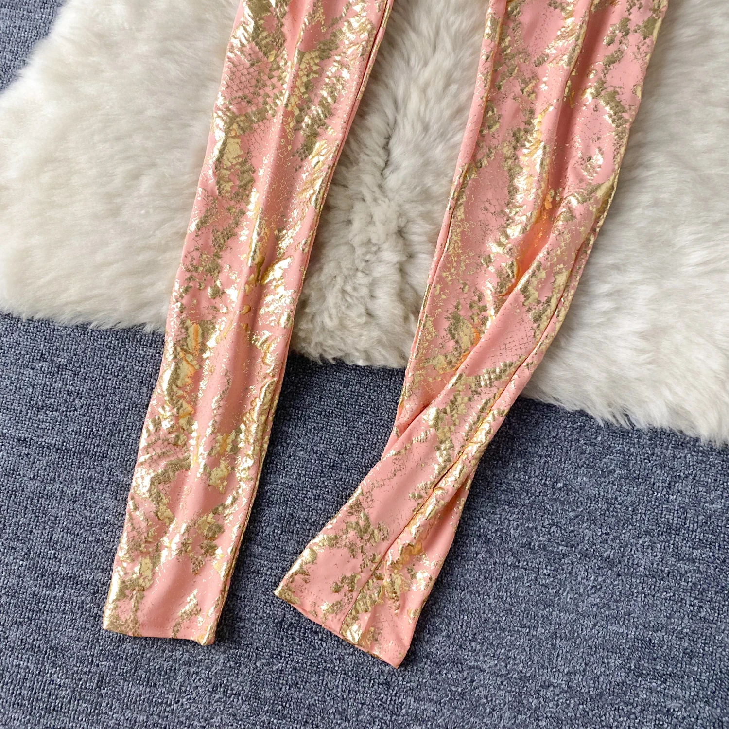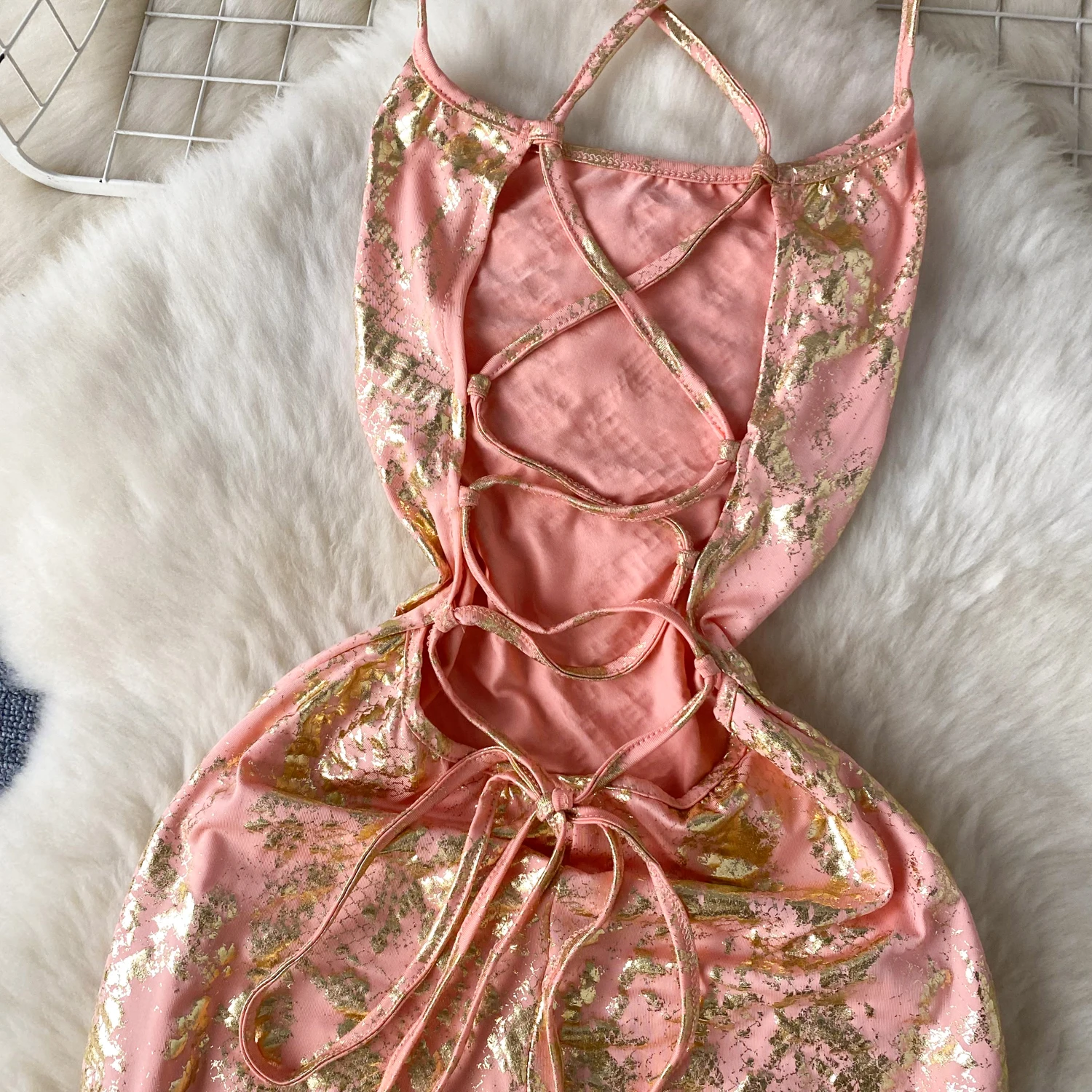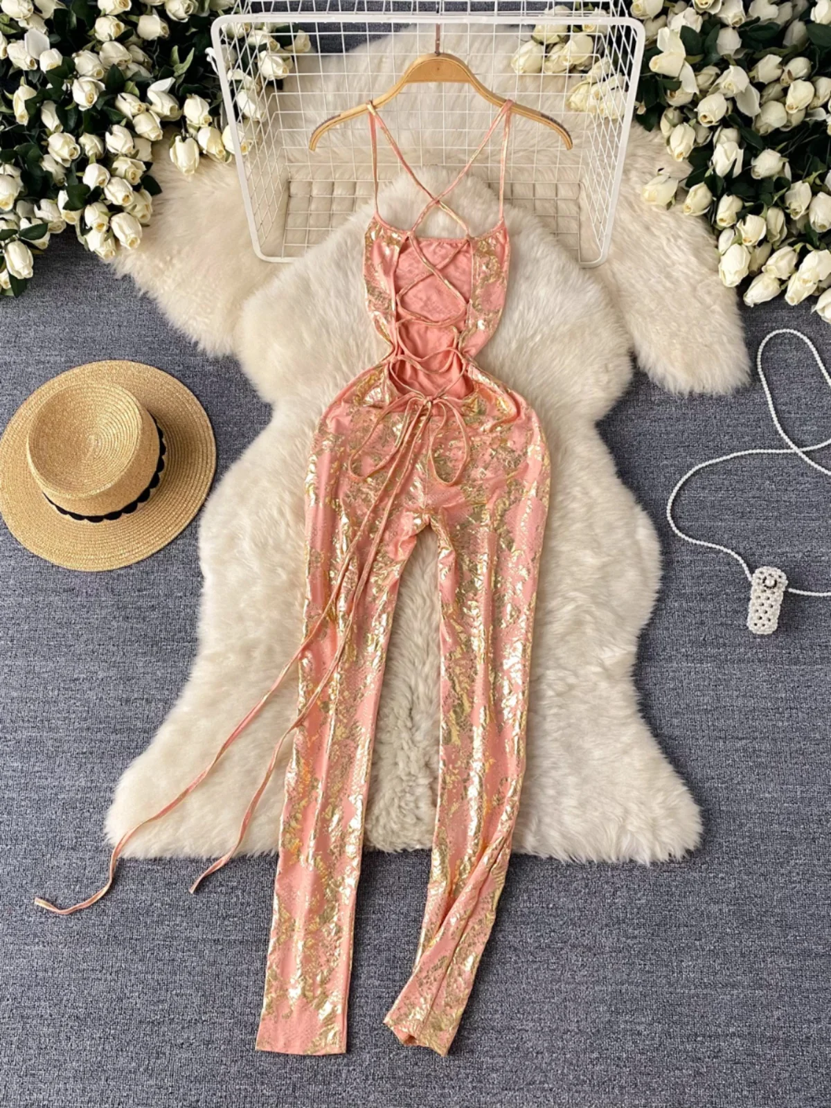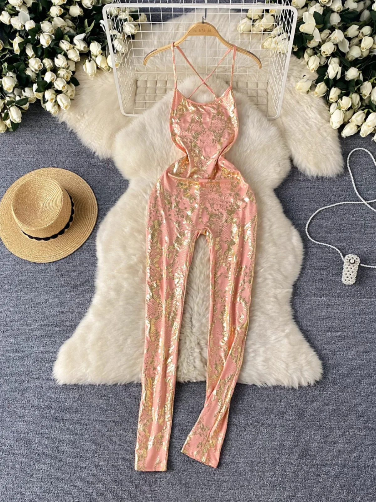 Foamlina Women Summer Sexy Spaghetti Strap Jumpsuits Fashion Sleeveless Backless Slim High Waist Floral Gilded Long Club Rompers