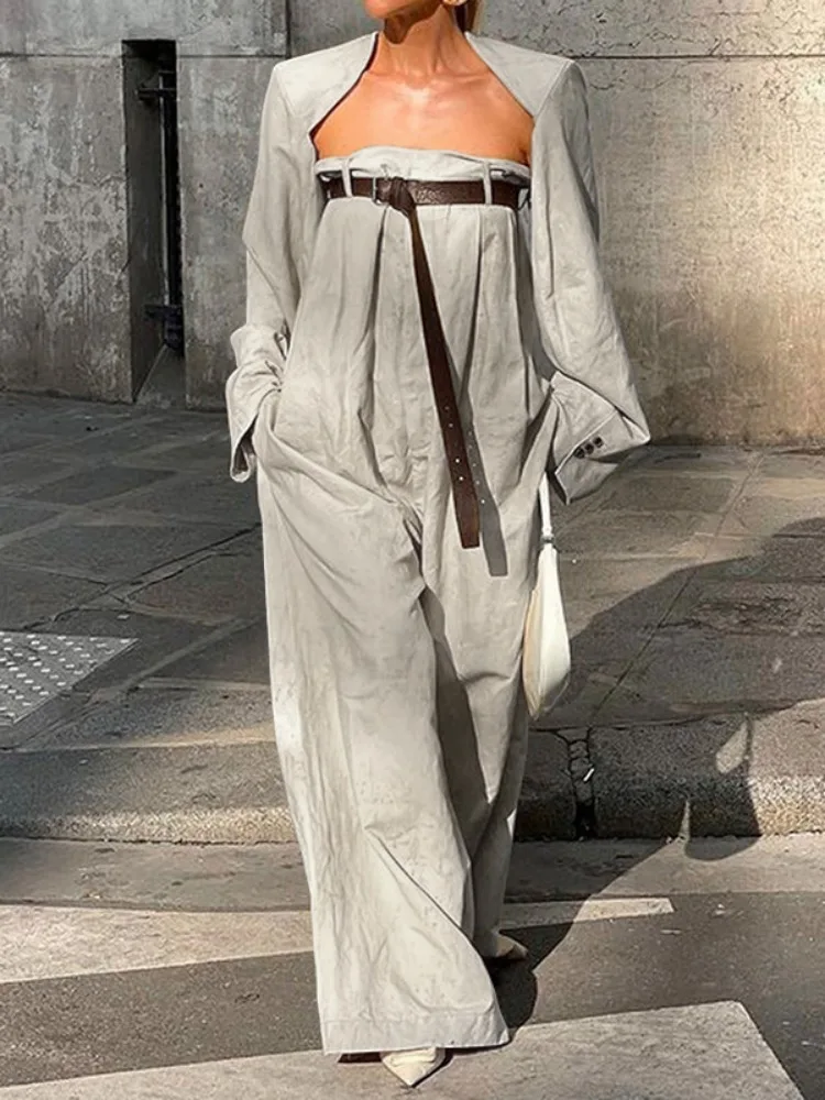 Freeacy Women’s Stylish Jumpsuit Set Collarless Long Sleeve Outerwear and Strapless Wide Leg Jumpsuits Summer Loose Fit Suit