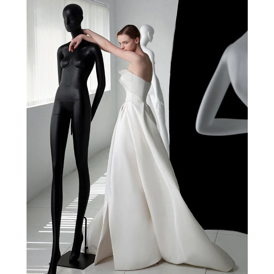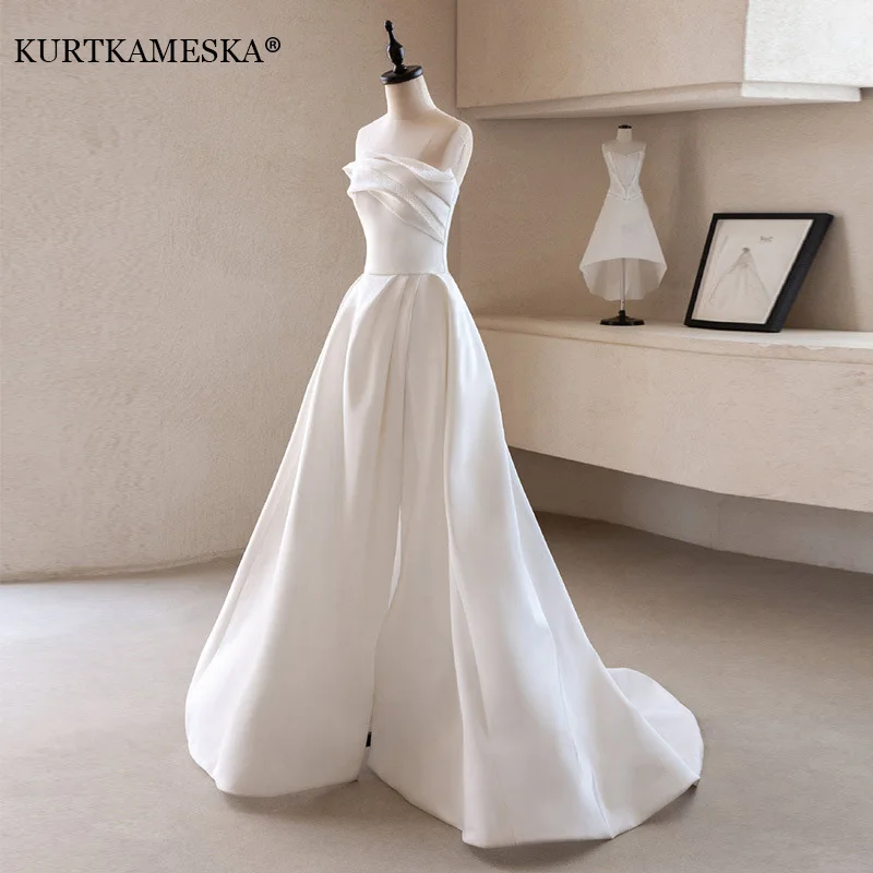 French Luxury White Satin Trailing Wedding Dresses for Bride 2026 Women Elegant Sexy Strapless Long Prom Party Dress vestidos