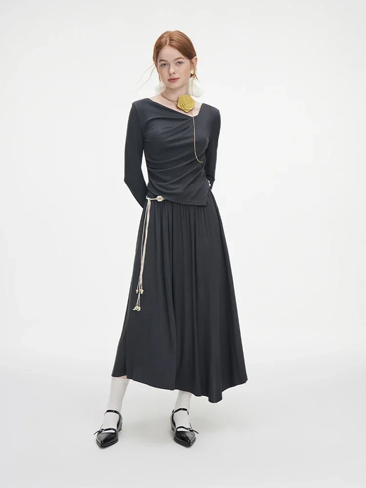 FSLE Women Autumn Knitted Elegant Set Dark Grey Blouse Skirt Asymmetric Design Thin Pullover Long Sleeve Top Long Knit Skirt