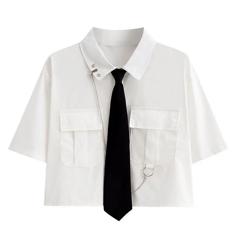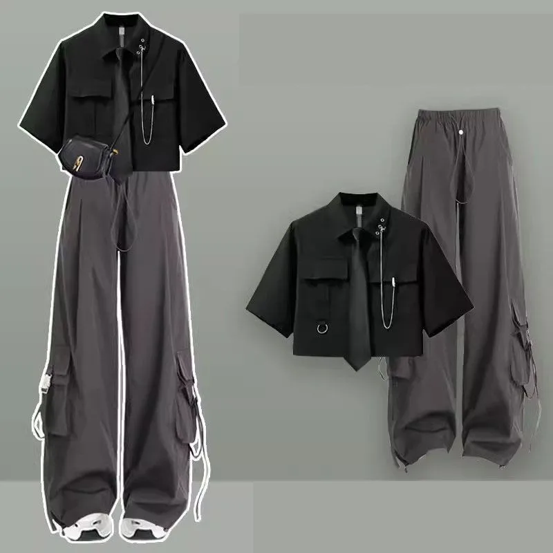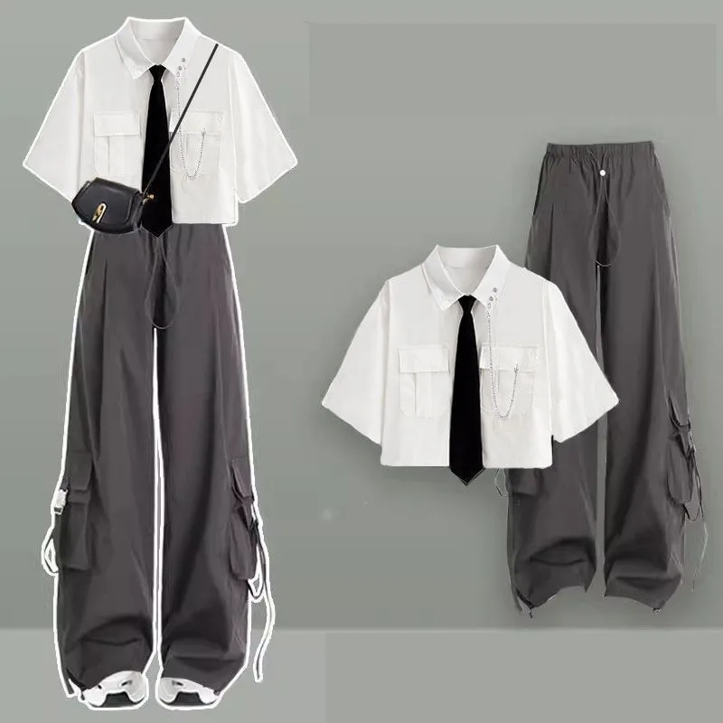 Girl 2026 Summer New Casual Tracksuit Matching Set Korean College Short-sleeve Shirt+Sport Wide Leg Cargo Pants Two-piece Suit